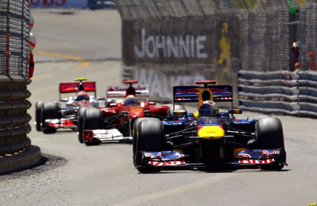 In a classic Monaco race, Vettel held the lead from a charging Fernando Alonso and Jenson Button. The Red Bull Racing driver's fragile Pirelli tires were over 50 laps old and with both Alonso and Button on much fresher tires, he had to keep them behind if he was to win his first Monaco Grand Prix.