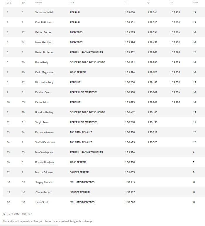 Q1 saw Red Bull racing driver Max Verstappen crash out at Turn 2 and the session was red flagged until the track was clear to go.The other Red Bull driver Ricciardo qualified P5 and will start the race 4th on the grid alongside the Mercedes of Bottas.