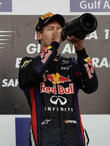 Red Bull Racing’s German driver Sebastian Vettel celebrates on the podium at the Bahrain International Circuit in Manama on April 21, 2013 during the Bahrain Formula One Grand Prix.