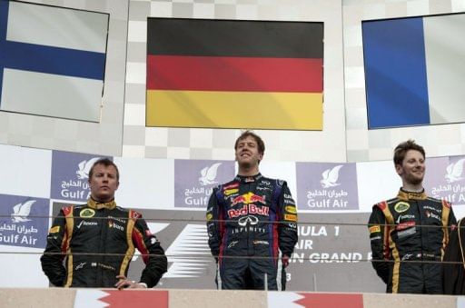 (L to R) Lotus F1 Team’s Finnish driver Kimi Raikkonen, Red Bull Racing’s German driver Sebastian Vettel and Lotus F1 Team’s French driver Romain Grosjean celebrate on the podium at the Bahrain International Circuit in Manama on April 21, 2013 during the Bahrain Formula One Grand Prix. Vettel won the race ahead of Raikkonen and Grojean respectively.