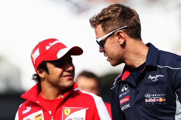 Sebastian Vettel (R) of Germany and Red Bull Racing talks with Felipe Massa of Brazil and Ferrari in the paddock following practice for the Spanish Formula One Grand Prix at the Circuit de Catalunya on May 10, 2013 in Montmelo, Spain. (Getty Images)