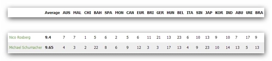 Note: Michael Schumacher’s poor performance in BAH (Bahrain Grand Prix) was due to a DRS failure in qualifying. His performances in British and German Grand Prix were exceptionally good due to the wet weather conditions.