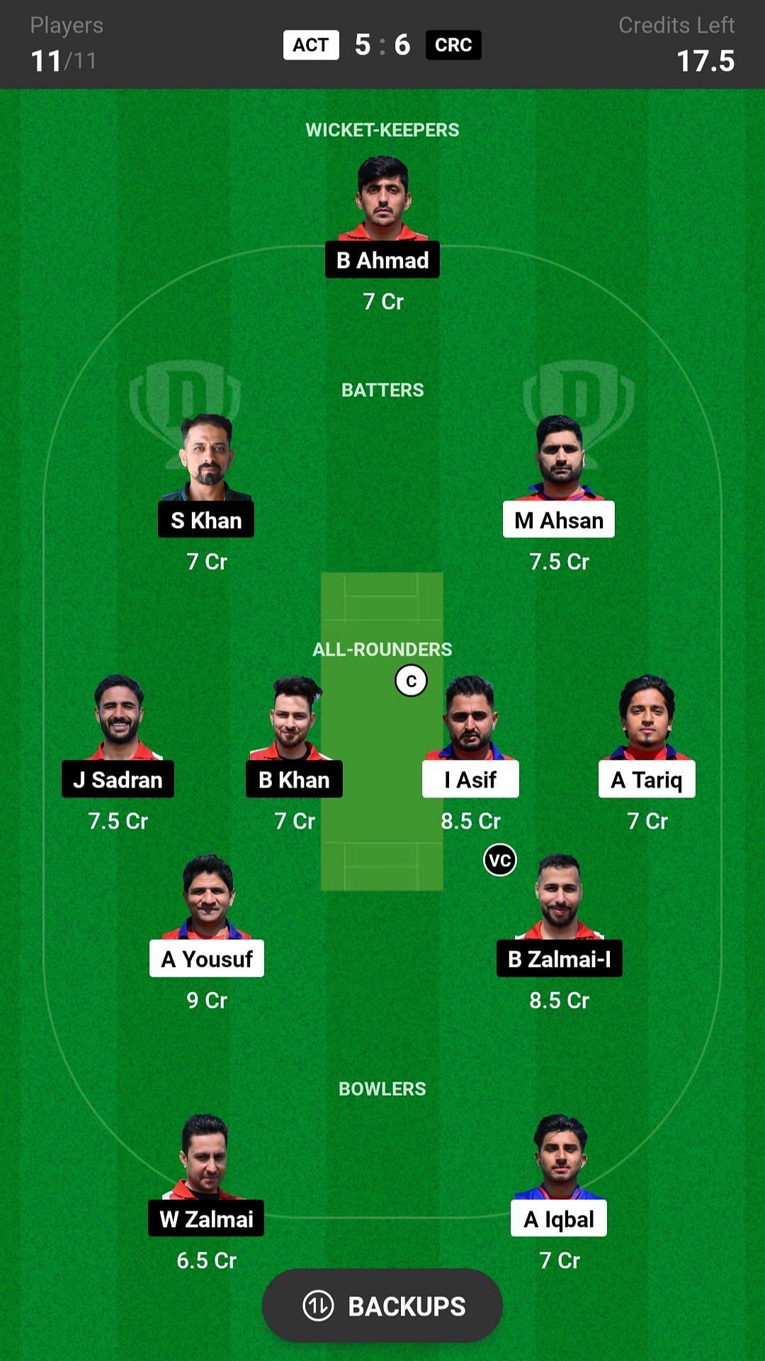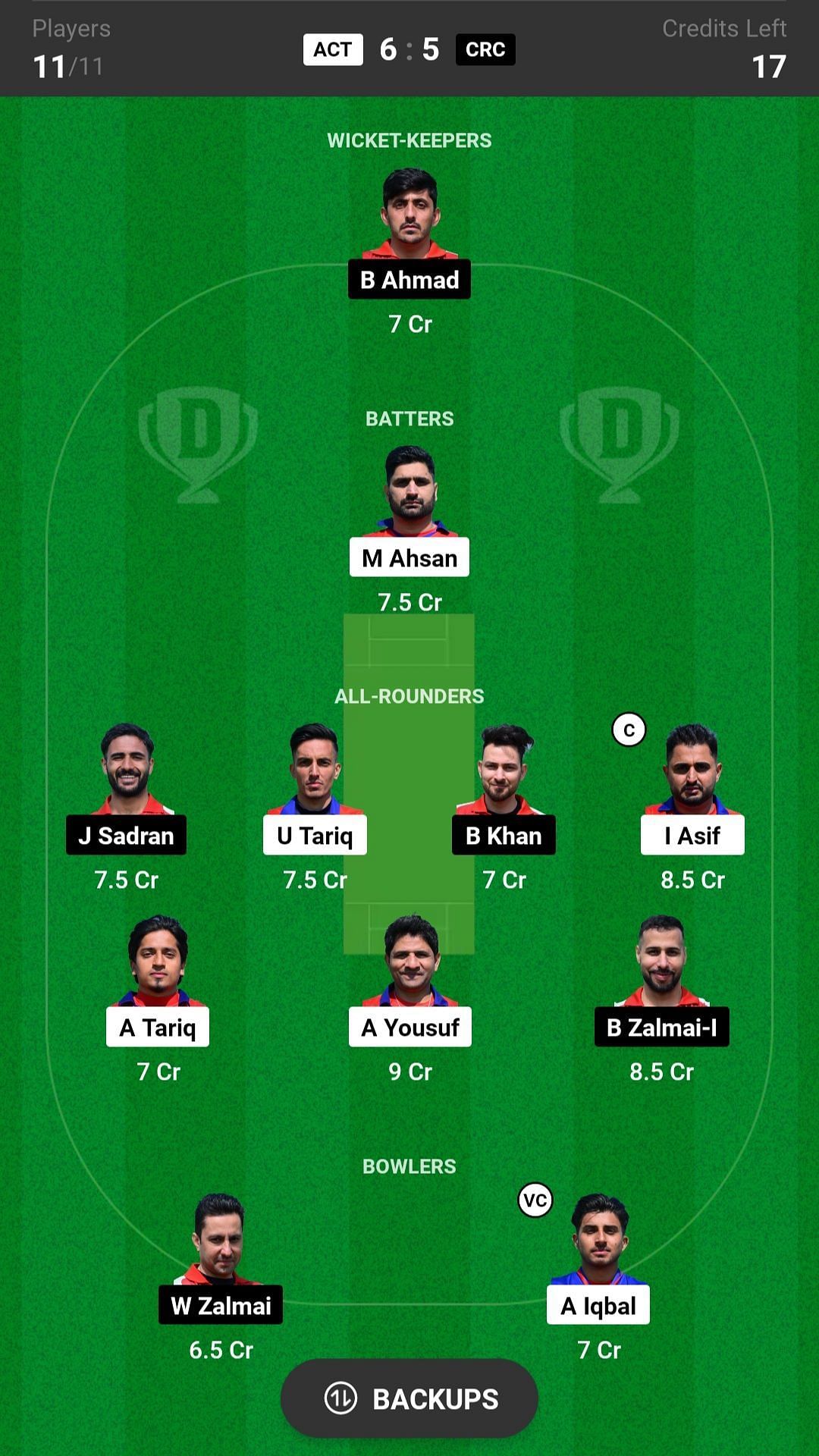 ACT vs CRC match captain and vice-captain choices