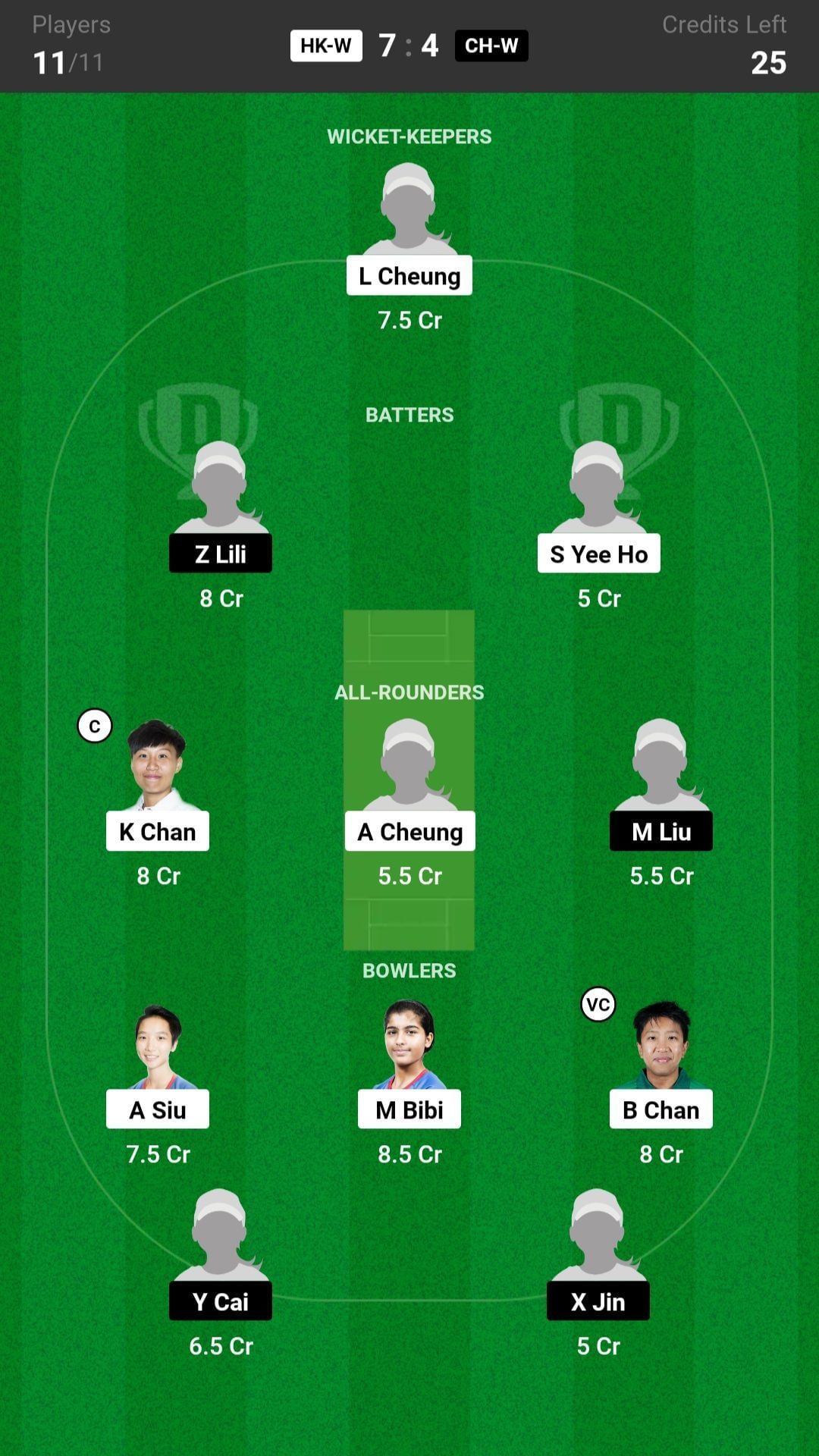 K Chan and A Cheung are the best all-rounder picks for the Dream11 team as they are batting in the top order and also completing their quota of overs. M Liu is another good pick for today's Dream11 team.