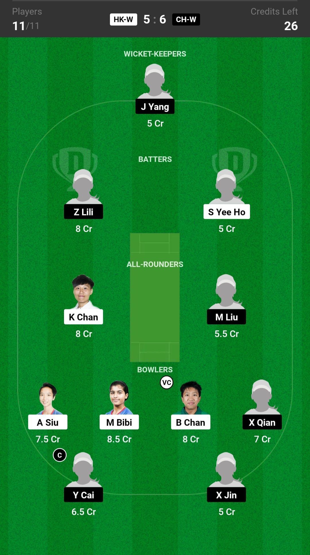 Z Lili and S Yee are the two best batsmen picks for the Dream11 team.
