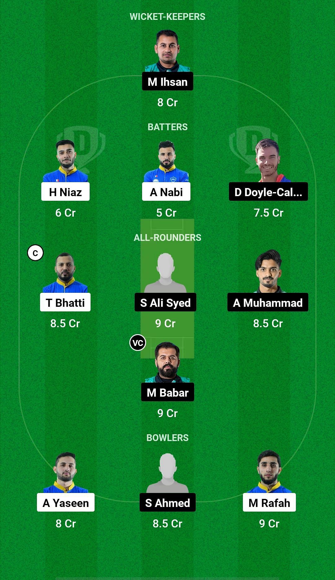 Batters: Mohammad Nisar, Ahmad Nabi, Hamza Niaz, Daniel Doyle Calle