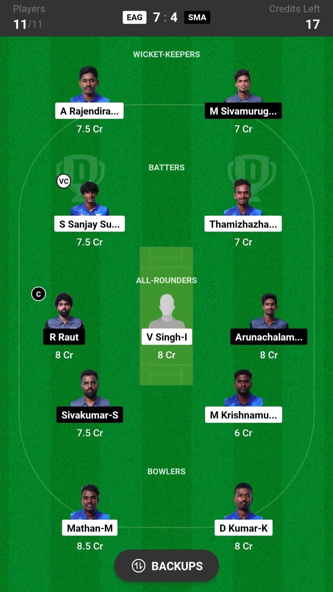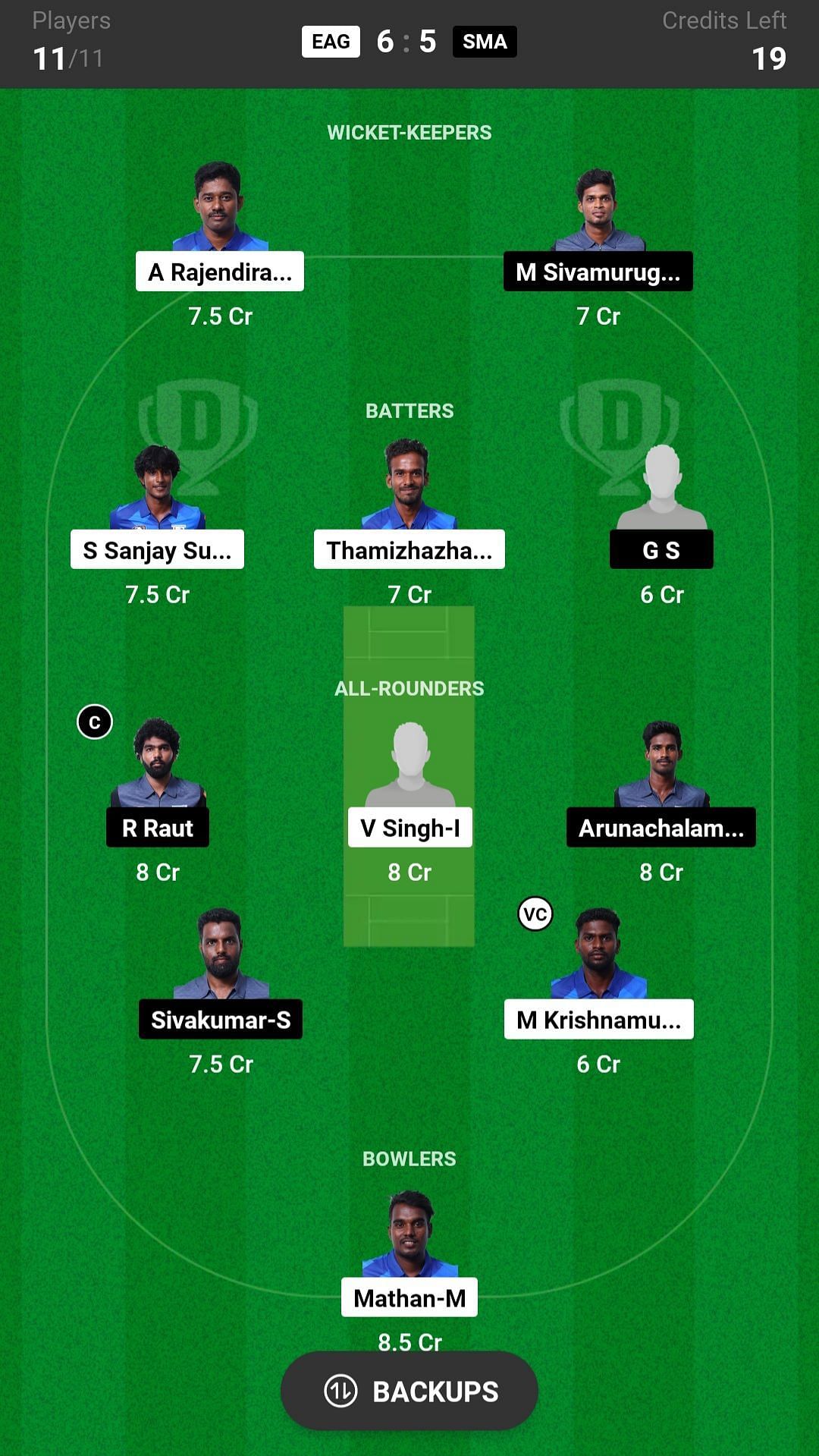 R Raut and Arunachalam V are the best all-rounder picks for the Dream11 team as they are batting in the top order and also completing their quota of overs. Sivakumar S is another good pick for today's Dream11 team.