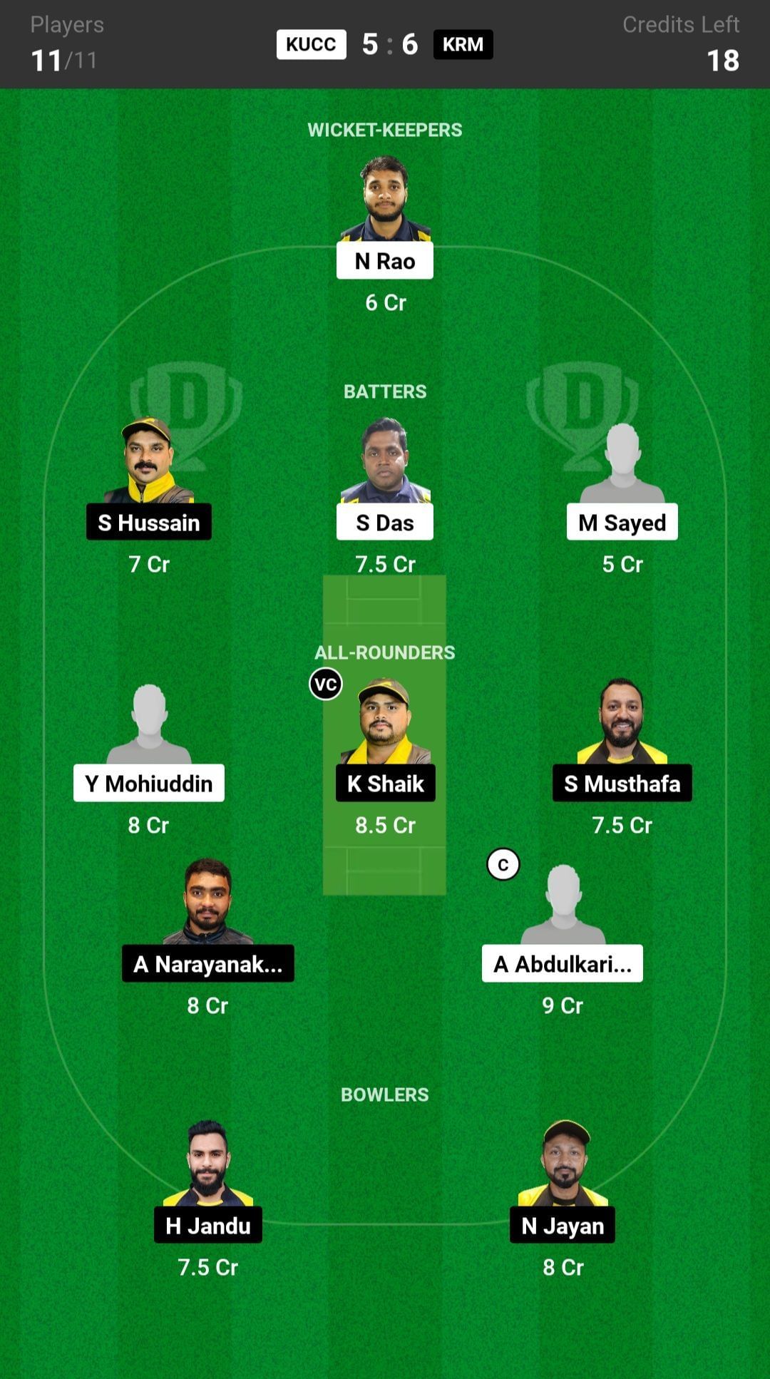 K Shaik and A Abdulkarim are the best all-rounder picks for the Dream11 team as they are batting in the top order and also completing their quota of overs. A Narayanakutty is another good pick for today's Dream11 team.