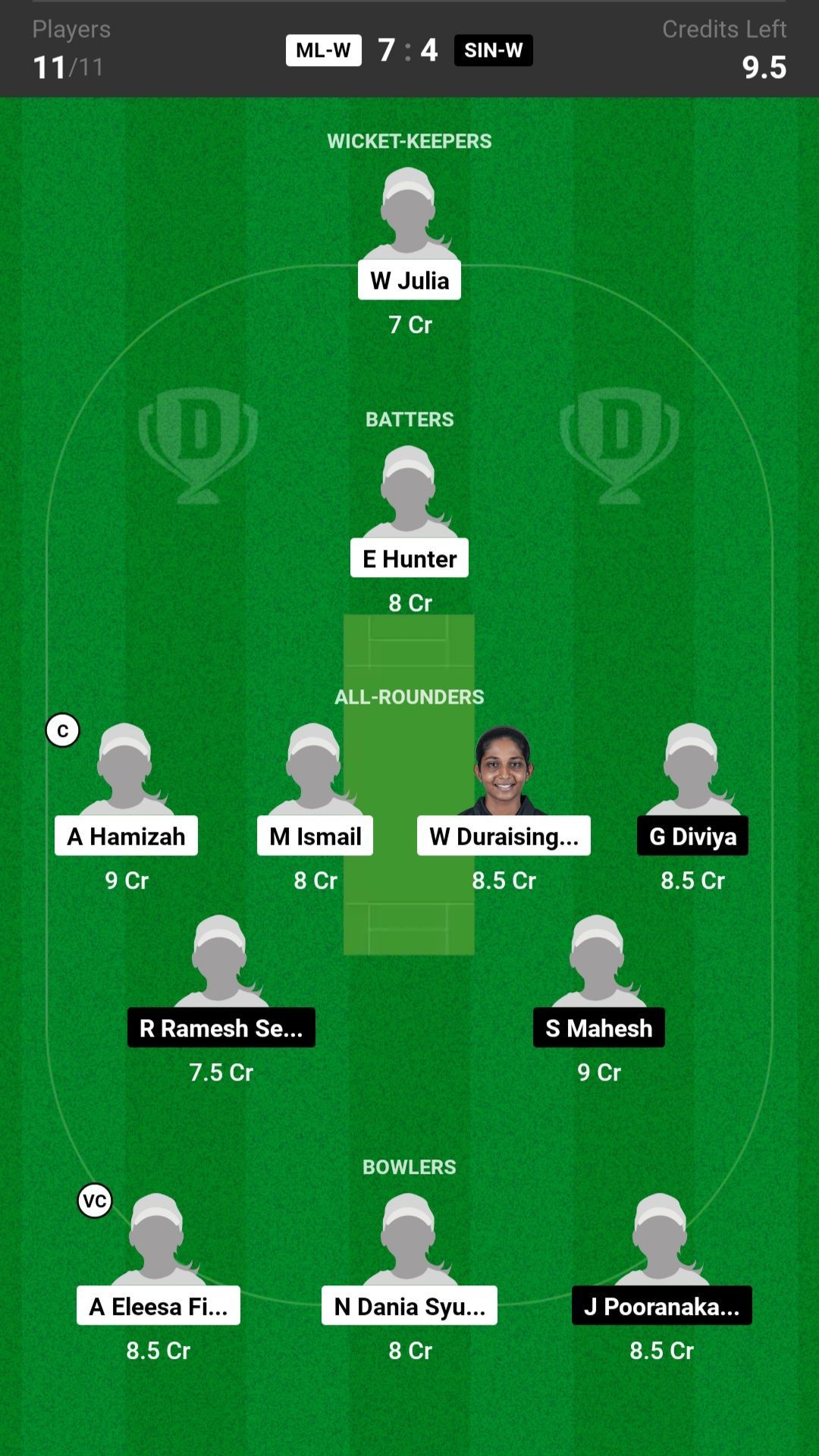 S Mahesh and A Hamizah are the best all-rounder picks for the Dream11 team as they are batting in the top order and also completing their quota of overs. W Duraisingam is another good pick for today's Dream11 team.