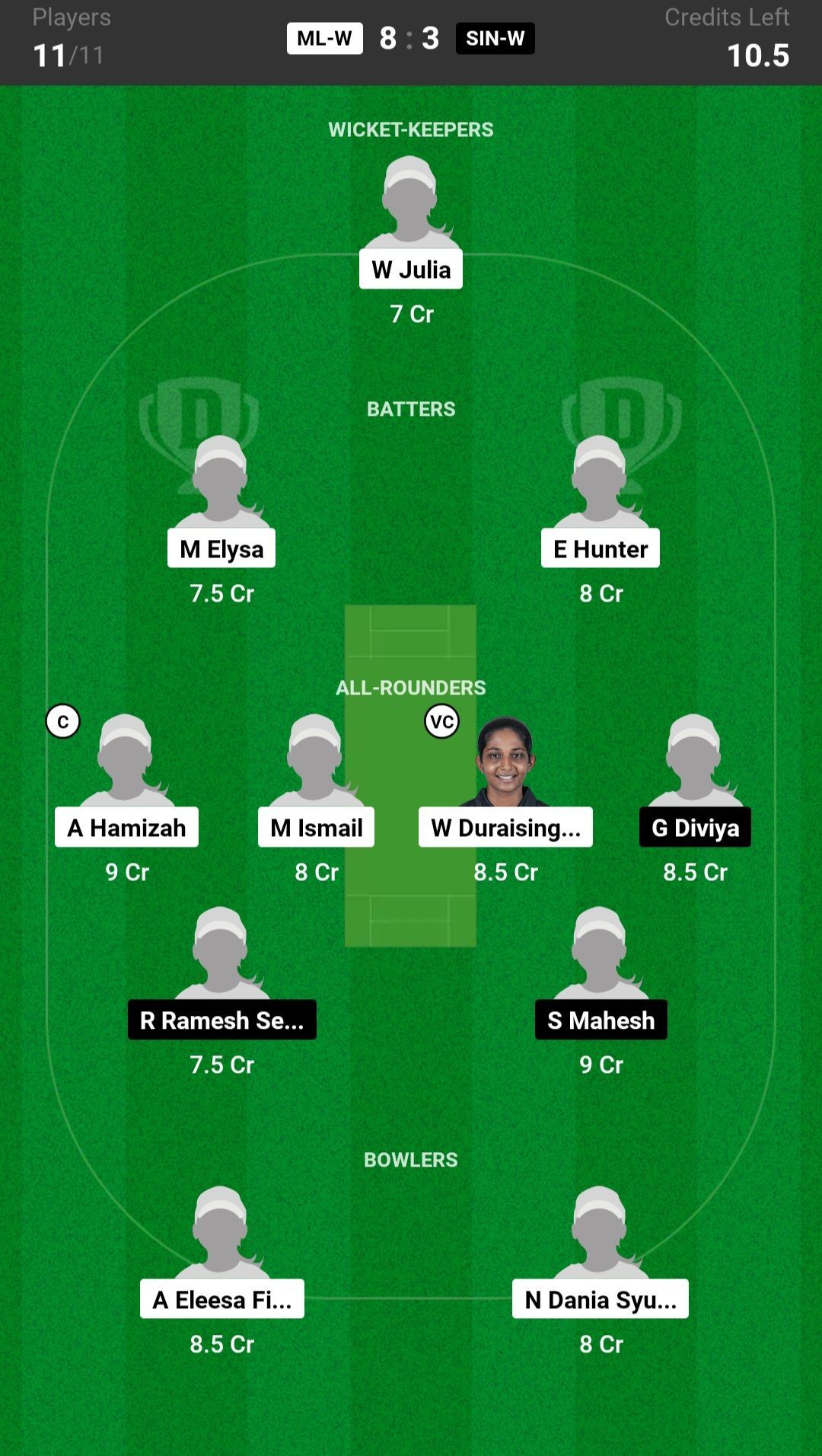 ML-W vs SIN-W match captain and vice-captain choices