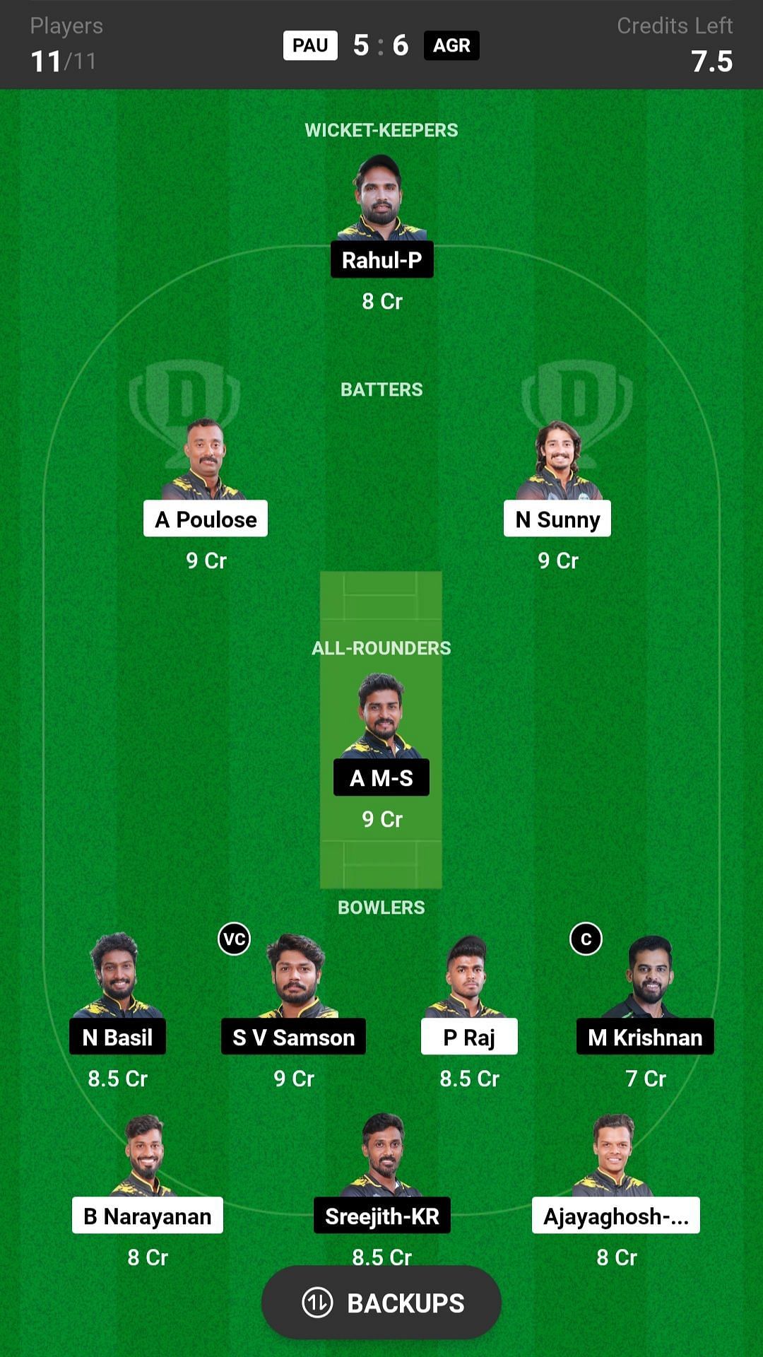 A MS and A Muhammad are the best all-rounder picks for the Dream11 team as they are batting in the top order and also completing their quota of overs. V Chandran is another good pick for today's Dream11 team.
