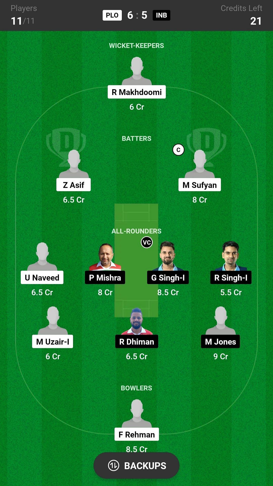 M Uzair and P Mishra are the best all-rounder picks for the Dream11 team as they are batting in the top order and also completing their quota of overs. G Singh is another good pick for today's Dream11 match.