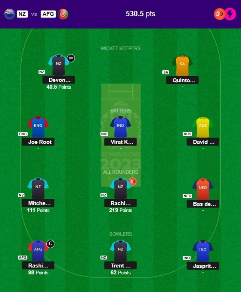 I'd be lying if I said the Triple Impact booster went well because despite sounding good on paper, it didn't quite work out the way I expected it to. Rashid Khan was really unlucky not to get a bigger haul, courtesy of some poor fielding from Afghanistan, but then again, Rachin Ravindra added 31 runs to his tally after a dropped chance, so I can't really complain.