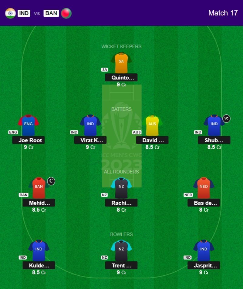 Players playing in Match 17: Virat Kohli (BAT) (IND), Jasprit Bumrah (BOWL) (IND), Mehidy Hasan Miraz (ALL) (BAN), Shubman Gill (BAT) (IND), and Kuldeep Yadav (BOWL) (IND).