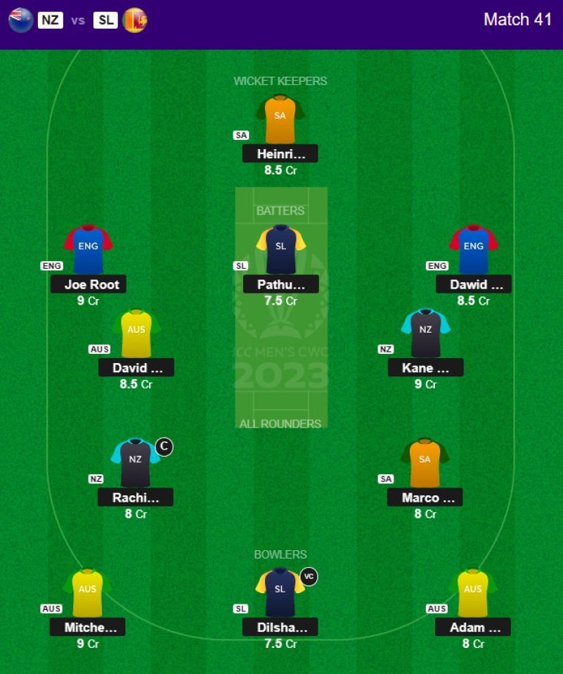 Players playing in Match 41: Dilshan Madushanka (BOWL) (SL), Pathum Nissanka (BAT) (SL), Rachin Ravindra (ALL) (NZ), and Kane Williamson (BAT) (NZ).