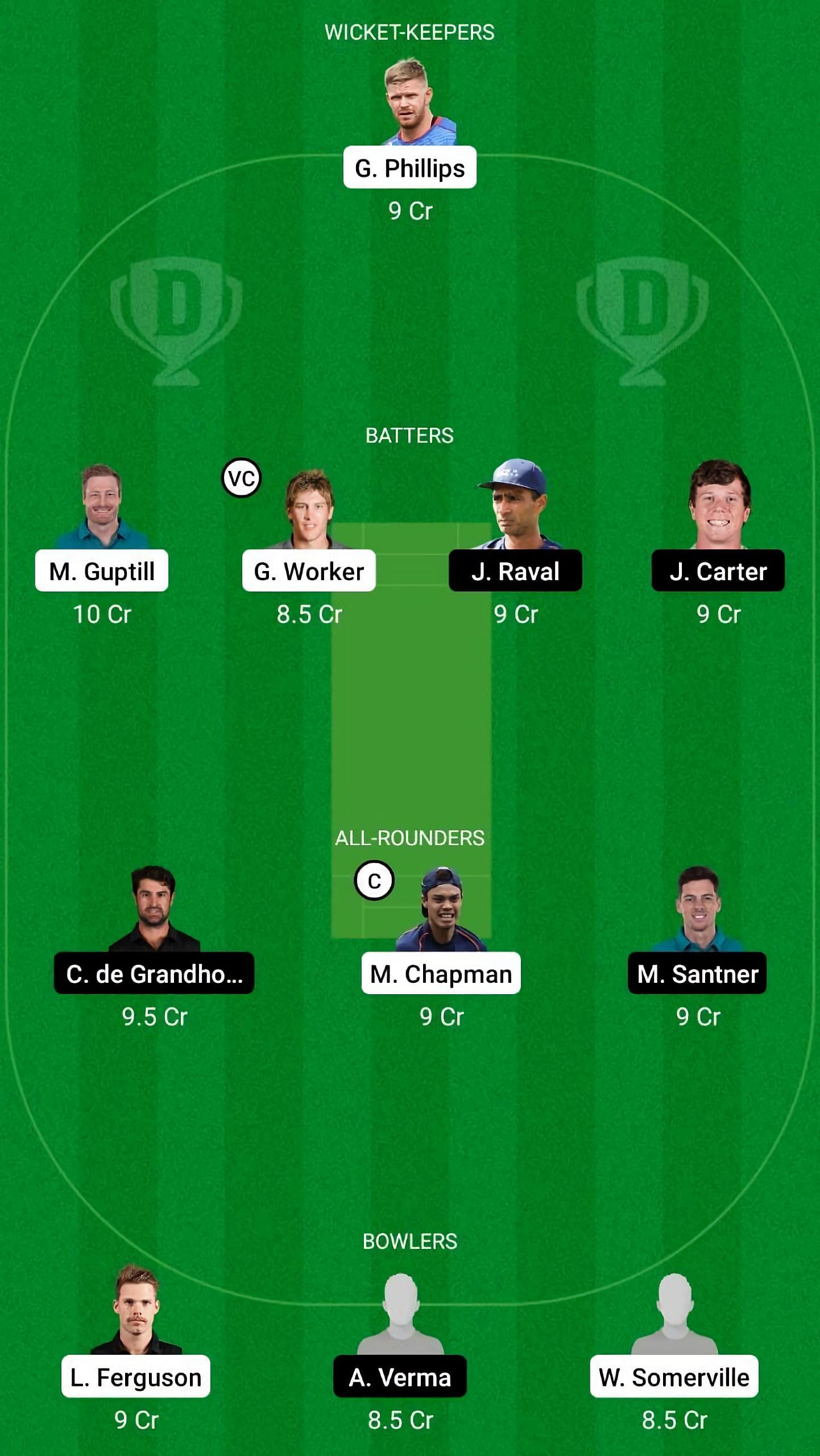 Fantasy Suggestion #1: Glenn Phillips, George Worker, Jeet Raval, Joe Carter, Martin Guptill, Mark Chapman, Colin de Grandhomme, Mitchell Santner, Will Somerville, Ashutosh Verma, Lockie Ferguson