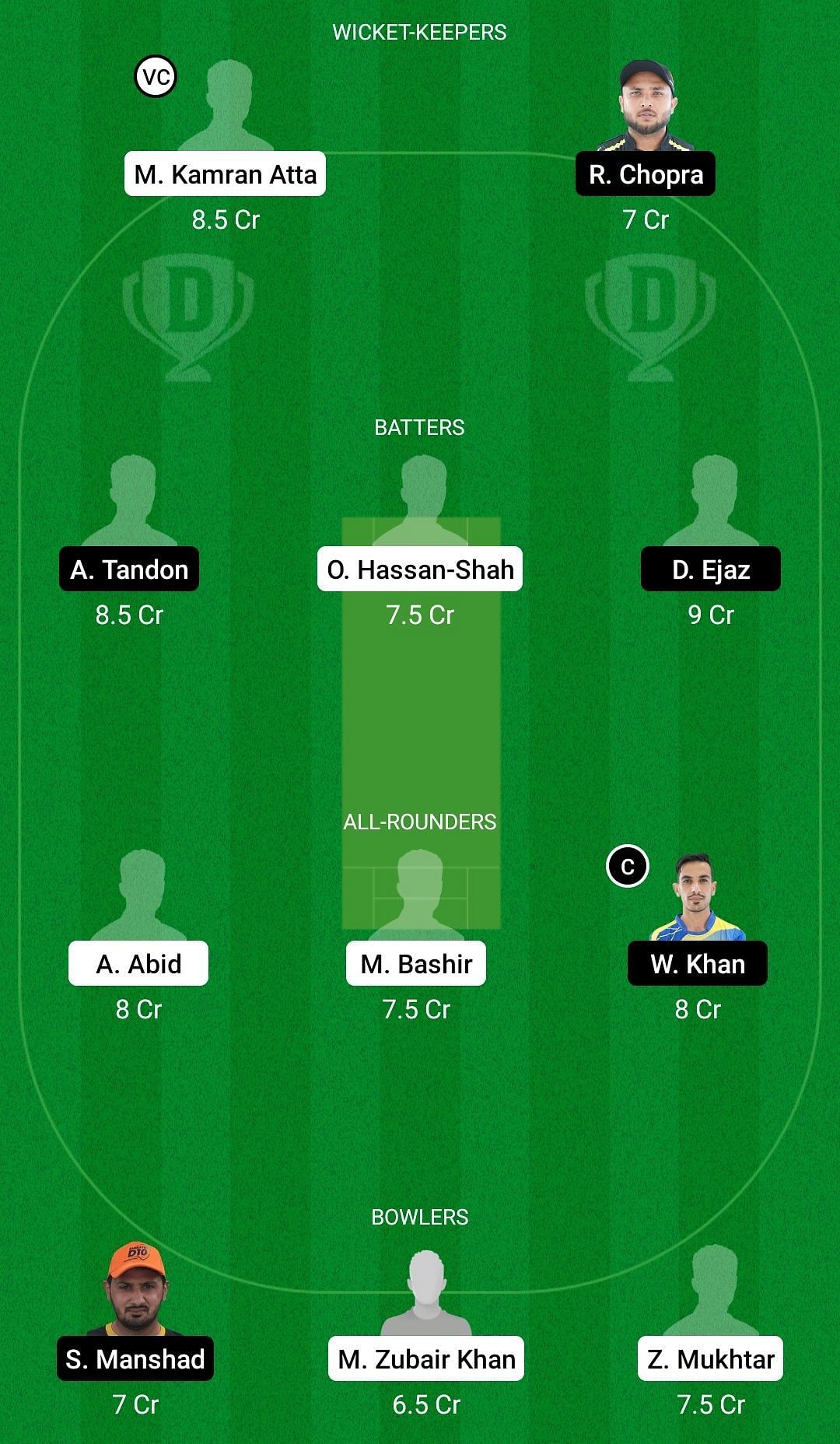 Both teams have some consistent all-rounders and they could be the key. Thus, the likes of Ali Abid, Mazhar Bashir and Wajid Khan along with top-order batters like Mohammad Kamran Atta and Rahul Chopra will be the ones to watch out for.