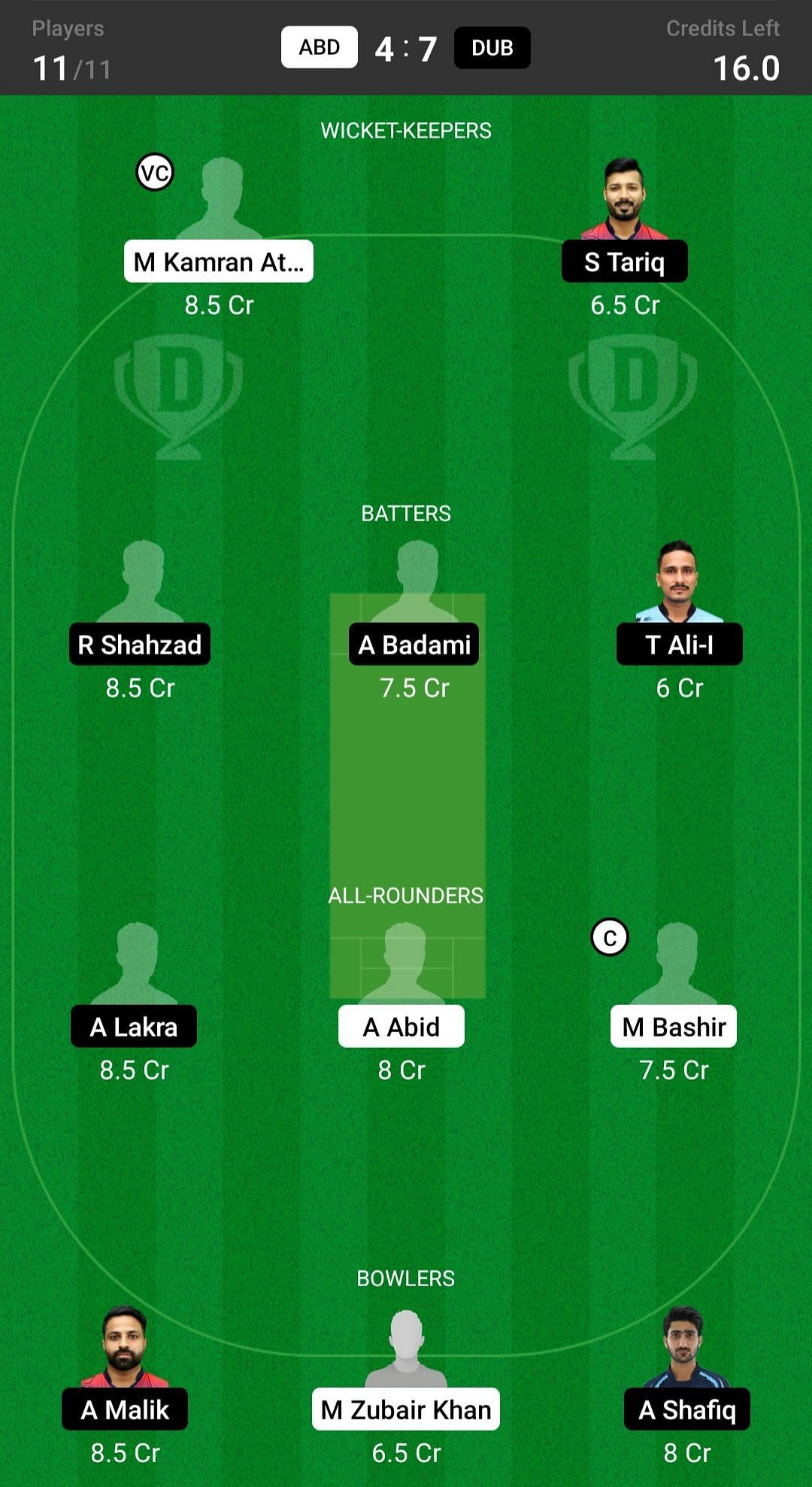 The top bowler picks for your DUB vs ABD Dream11 team are A Shafiq and M Zubair. Both have bowled brilliantly in the last few matches, and are also expected to bowl in the death overs, thus increasing their chances of picking up wickets.