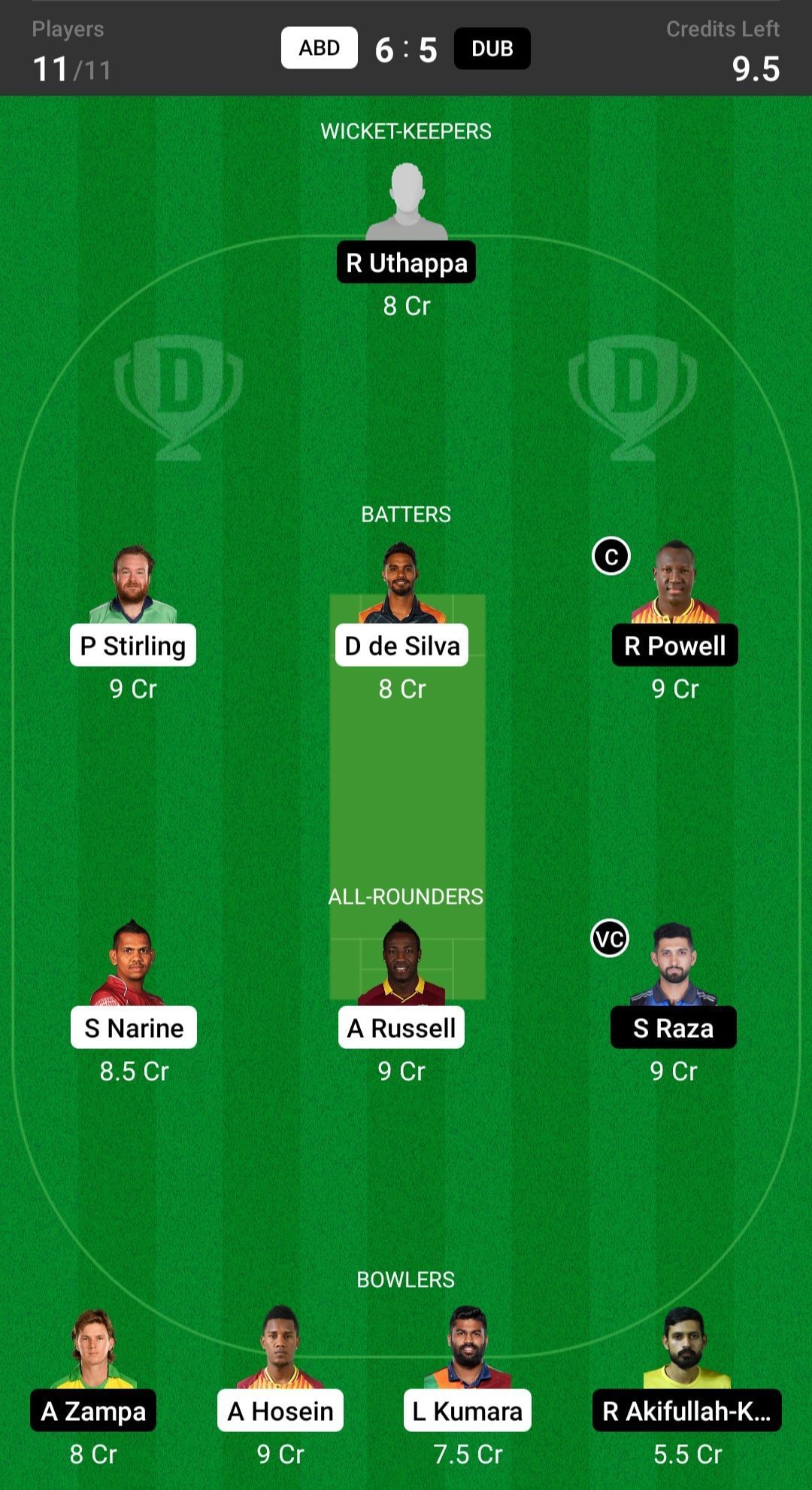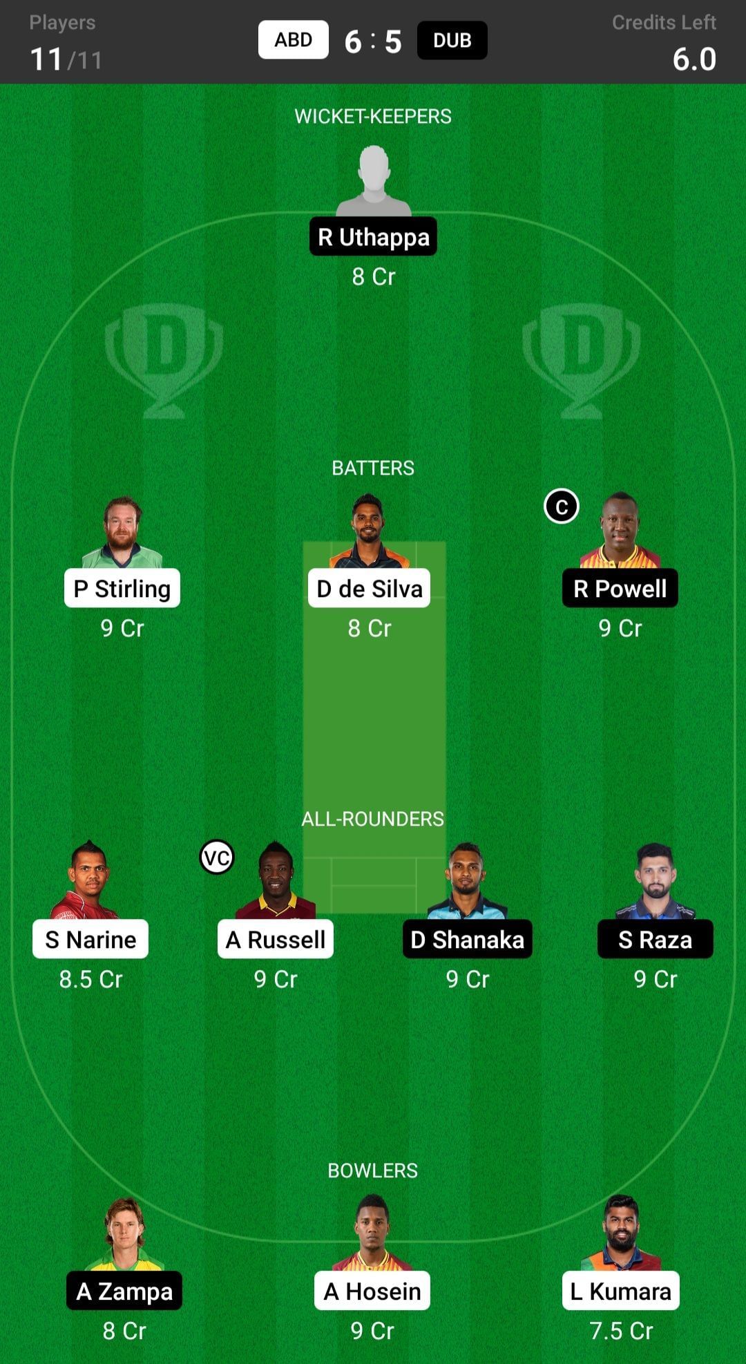 R Powell and P Stirling are the two best batsmen picks for the Dream11 team. D De Silva has played exceptionally well in the last few matches, so he is also a good pick for today's Dream11 team.