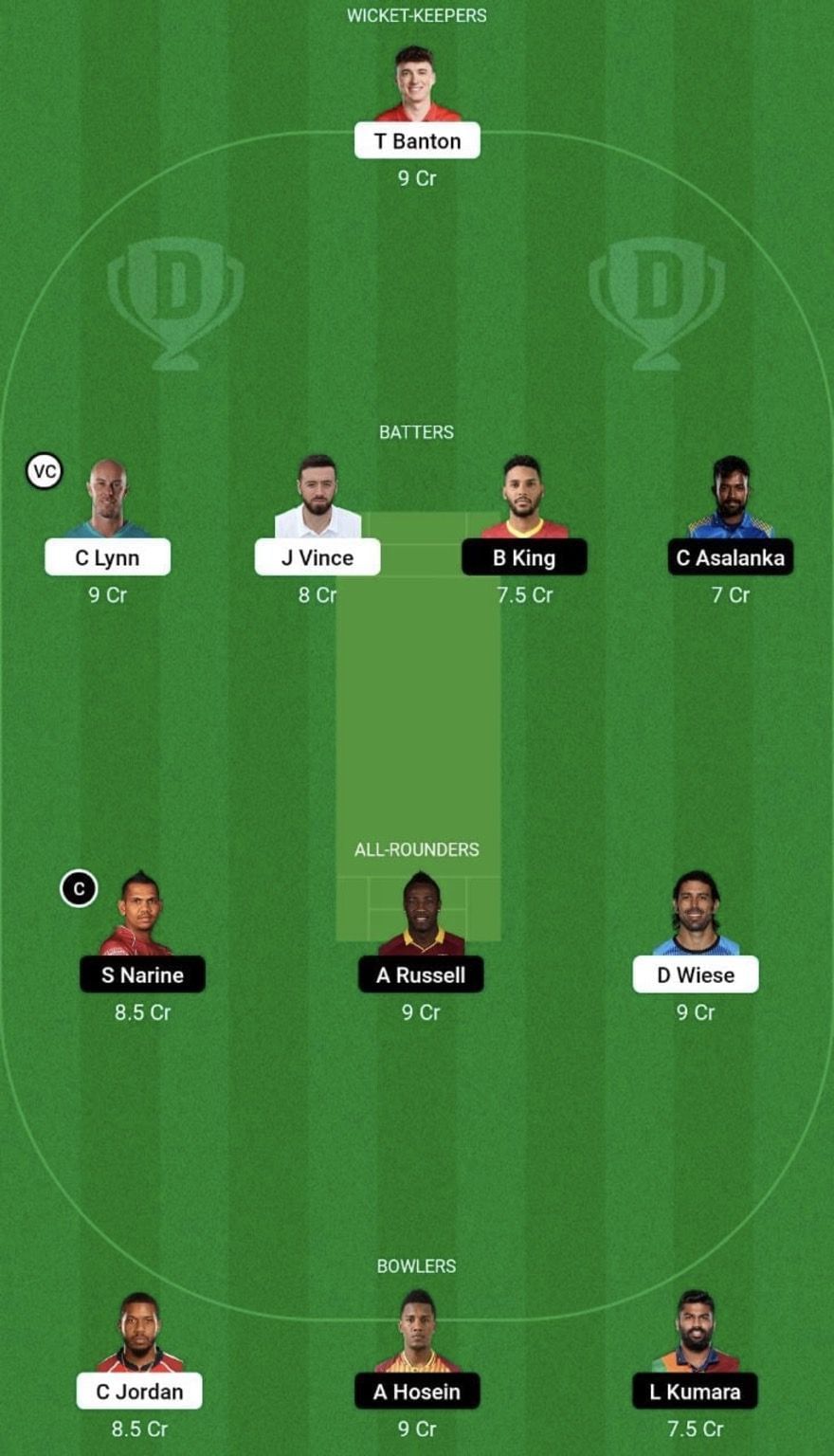 Bowlers: Chris Jordan, Akeal Hosein, Lahiru Kumara