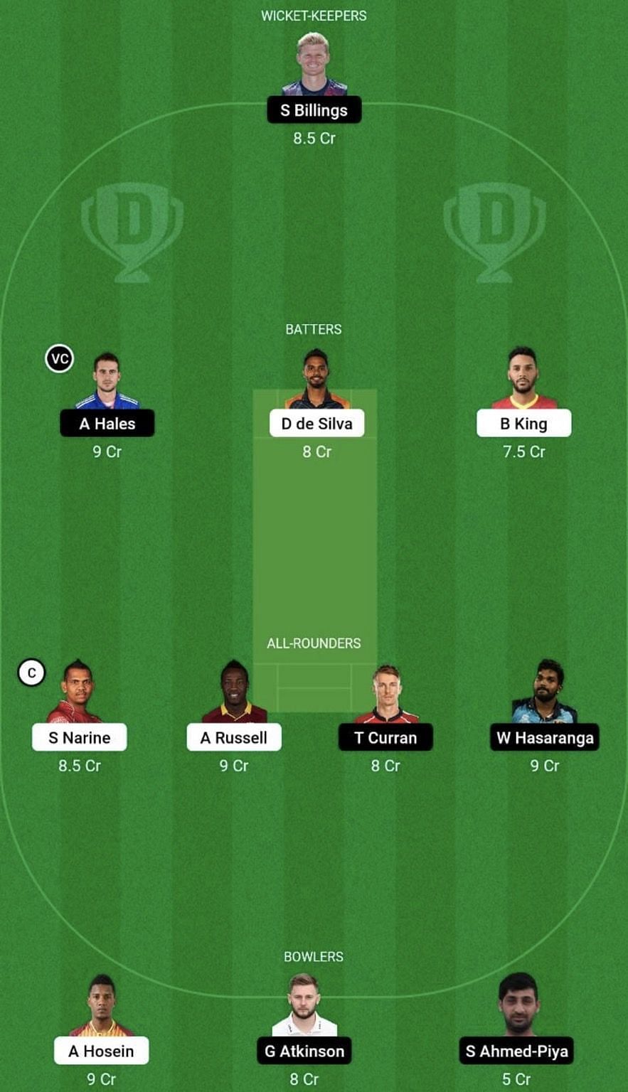Charith Asalanka, Kennar Lewis (wk), Colin Ingram, Brandon King, Dhananjaya de Silva, Andre Russell, Akeal Hosein, Sunil Narine (c), Lahiru Kumara, Sabir Rao, and Matiullah Khan.