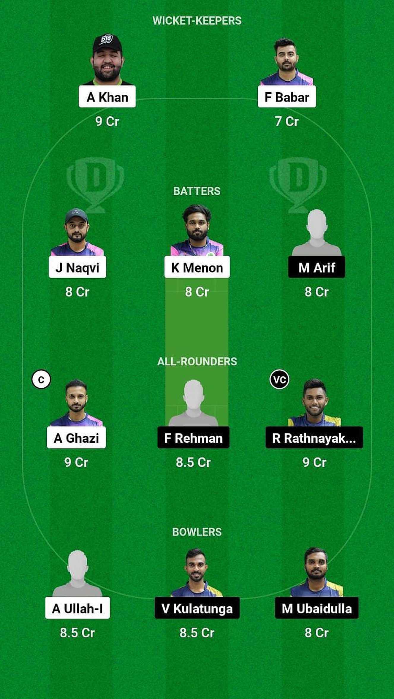 Adnaan Khan is a talented wicket-keeper batter who could be a great pick for your Dream11 fantasy outfit for this game. He bats in the top order and has scored 151 runs at a strike rate of 222.06 in four Sharjah Ramadan T10 League games.