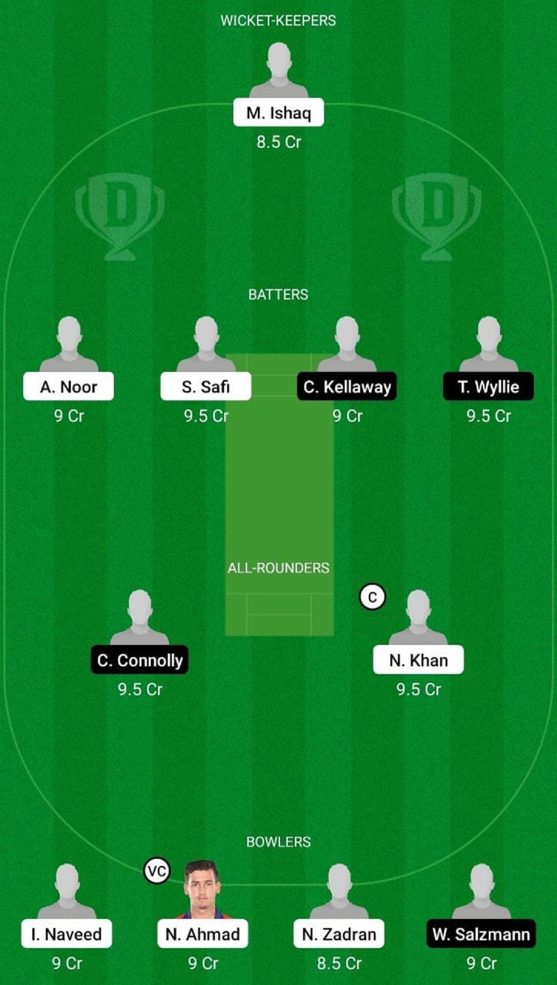 Fantasy Suggestion #1: M Ishaq, T Wyllie, S Safi, C Kellaway, A Noor, N Khan, C Connolly, N Ahmad, I Naveed, W Salzmann, N Zadran