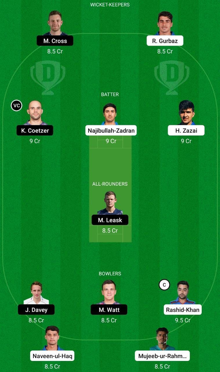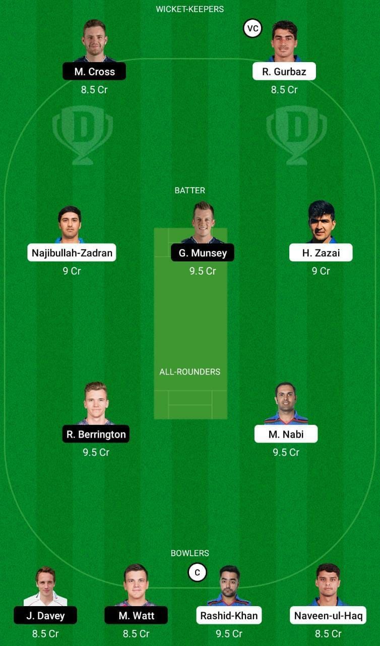 Fantasy Suggestion #1: Matt Cross, Rahmanullah Gurbaz, Najibullah Zadran, George Munsey, Hazratullah Zazai, Richie Berrington, Mohammad Nabi, Rashid Khan, Mark Watt, Josh Davey and Naveen ul Haq