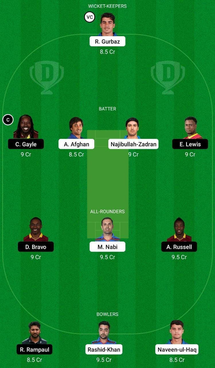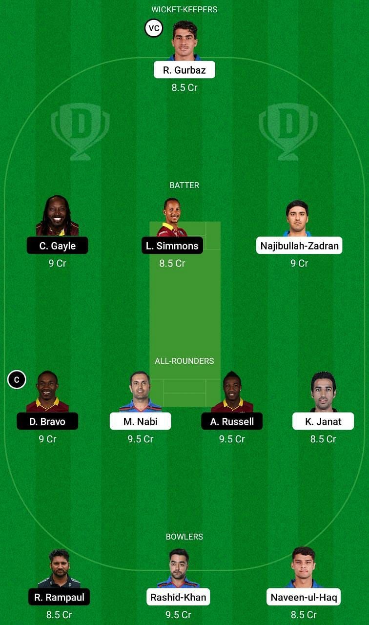 Fantasy Suggestion #2: Rahmanullah Gurbaz, Chris Gayle, Najibullah Zadran, Karim Janat, Lendl Simmons, Mohd Nabi, Andre Russell, Dwayne Bravo, Ravi Rampaul, Rashid Khan and Naveen ul Haq