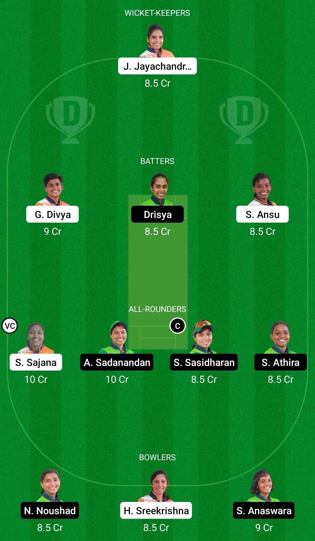 Team Emerald Probable Playing XI: M Abina (wk), Stanly Steffi, Drisya, Akshaya Sadanandan (c), Shani Sasidharan, Athira Sanal, Soniya Babu, Anaswara Santosh, Najla Noushad, Sabin Miriam Keziah, Loordh Nithya.