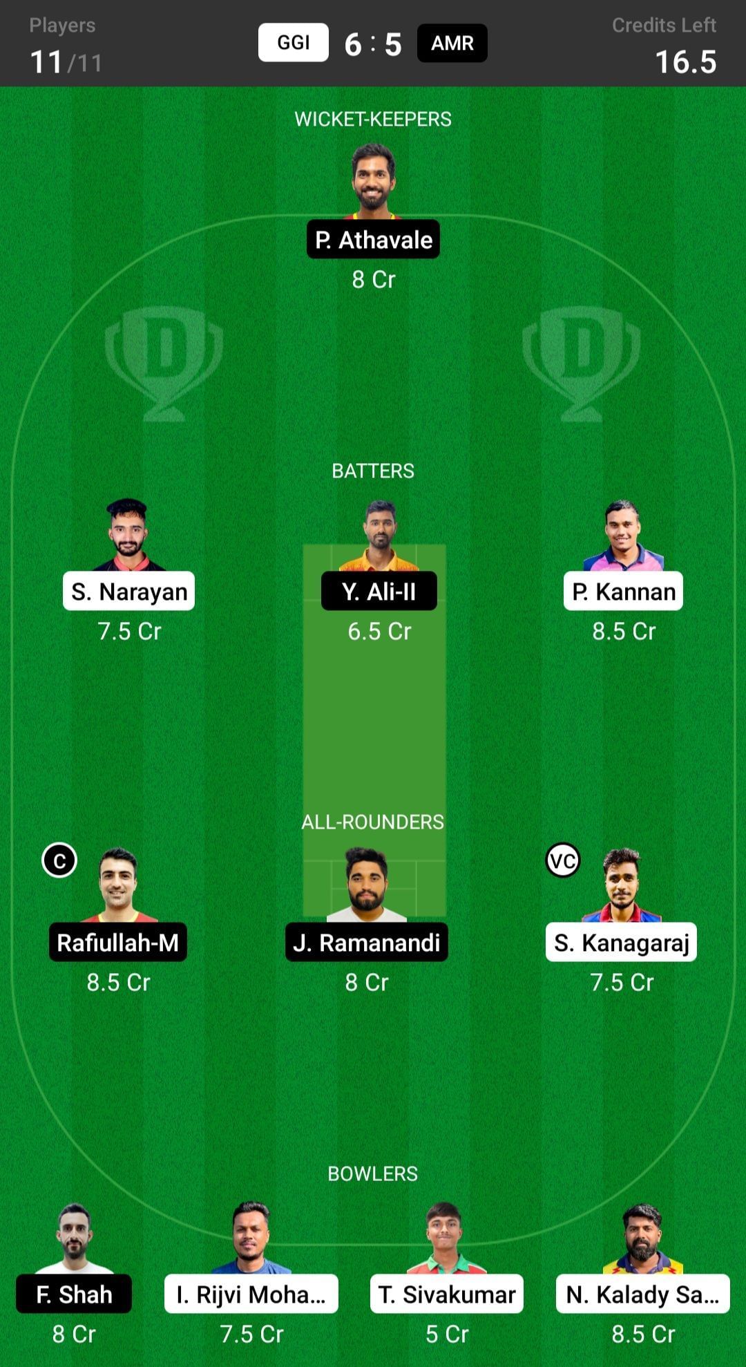 Rafiullah M and J Ramanandi are the best all-rounder picks for the Dream11 team as they are batting in the top order and also completing their quota of overs. S Kanagaraj is another good pick for today's Dream11 team.