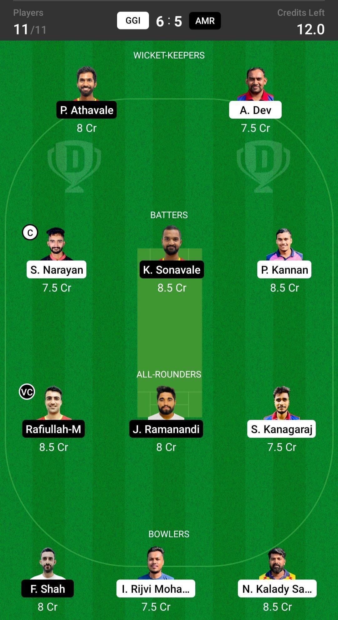 S Narayan and K Sonavale are the two best batter picks for the Dream11 team. P Kannan has performed exceptionally well in the previous few matches, so he is another good pick for today's match.