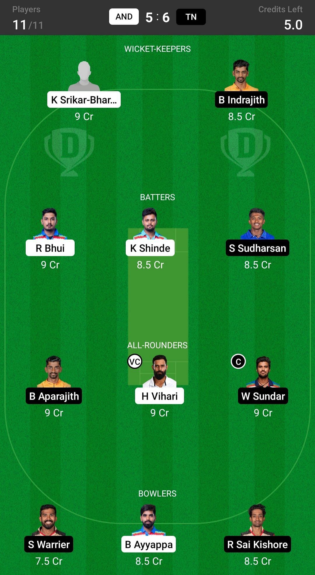 R Bhui and S Sudharsan are the two best batsmen picks for the Dream11 team. K Shinde has played exceptionally well in the last few matches, so he is also a good pick for today's Dream11 team.
