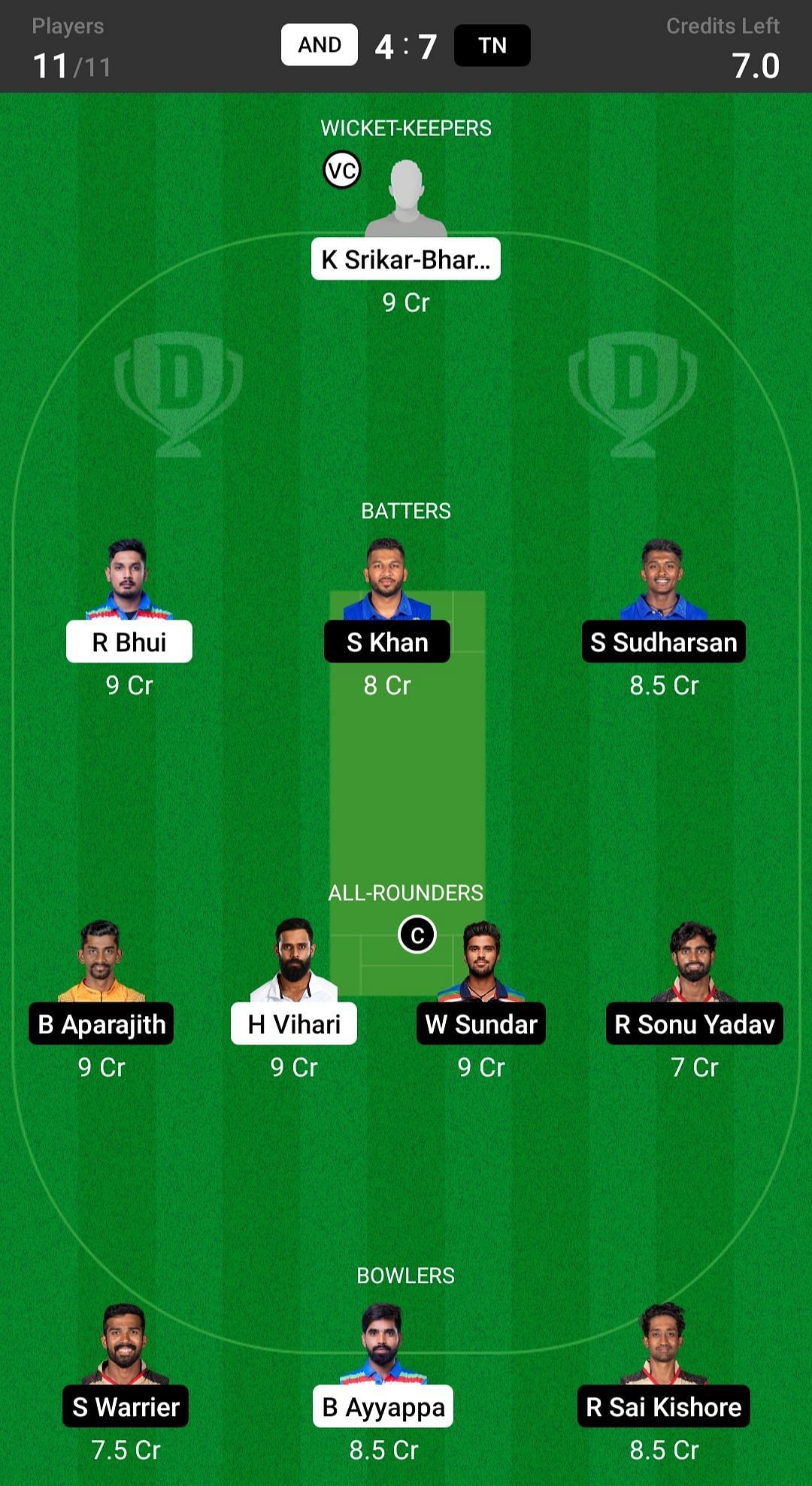 B Aparajith and H Vihari are the best all-rounder picks for the Dream11 team as they are batting in the top order and also completing their quota of 10 overs. W Sundar is another good pick for today's Dream11 team.