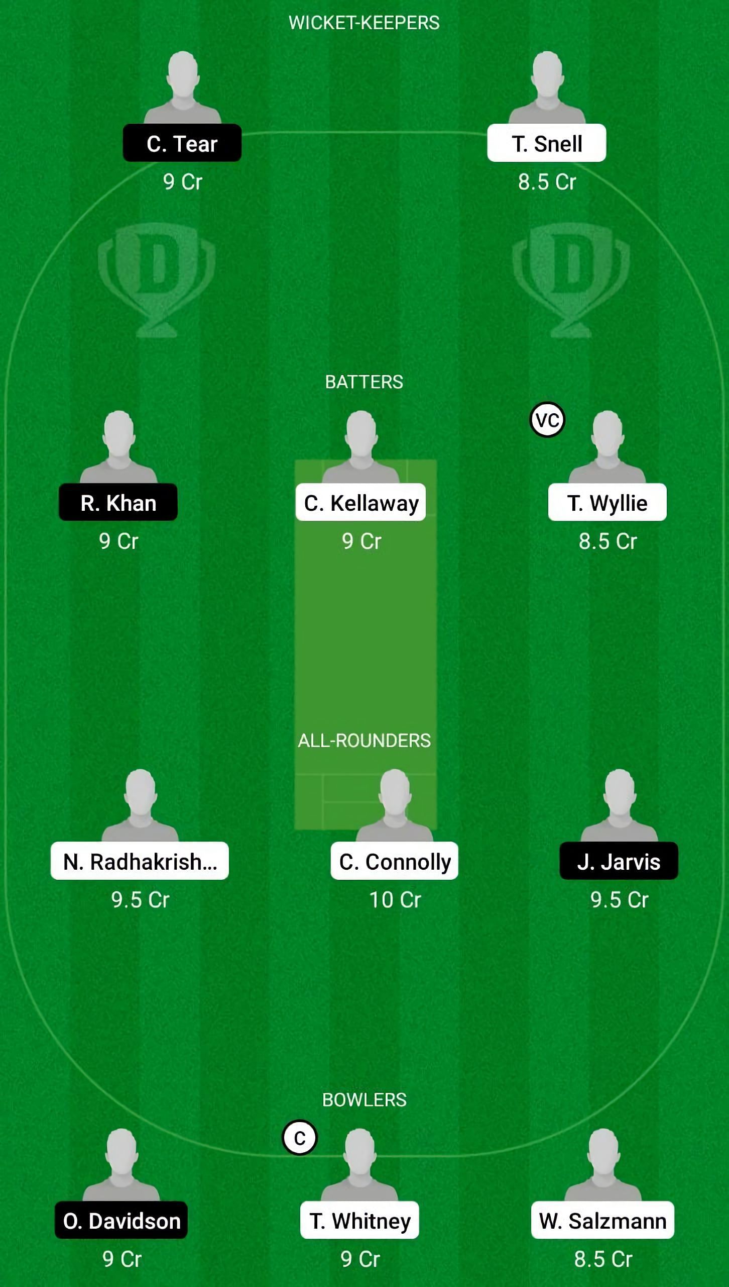 Fantasy Suggestion #2: C Tear, T Snell, T Wyllie, C Kellaway, R Khan, N Radhakrishnan, J Jaris, C Connolly, T Whitney, O Davidson, W Salzmann