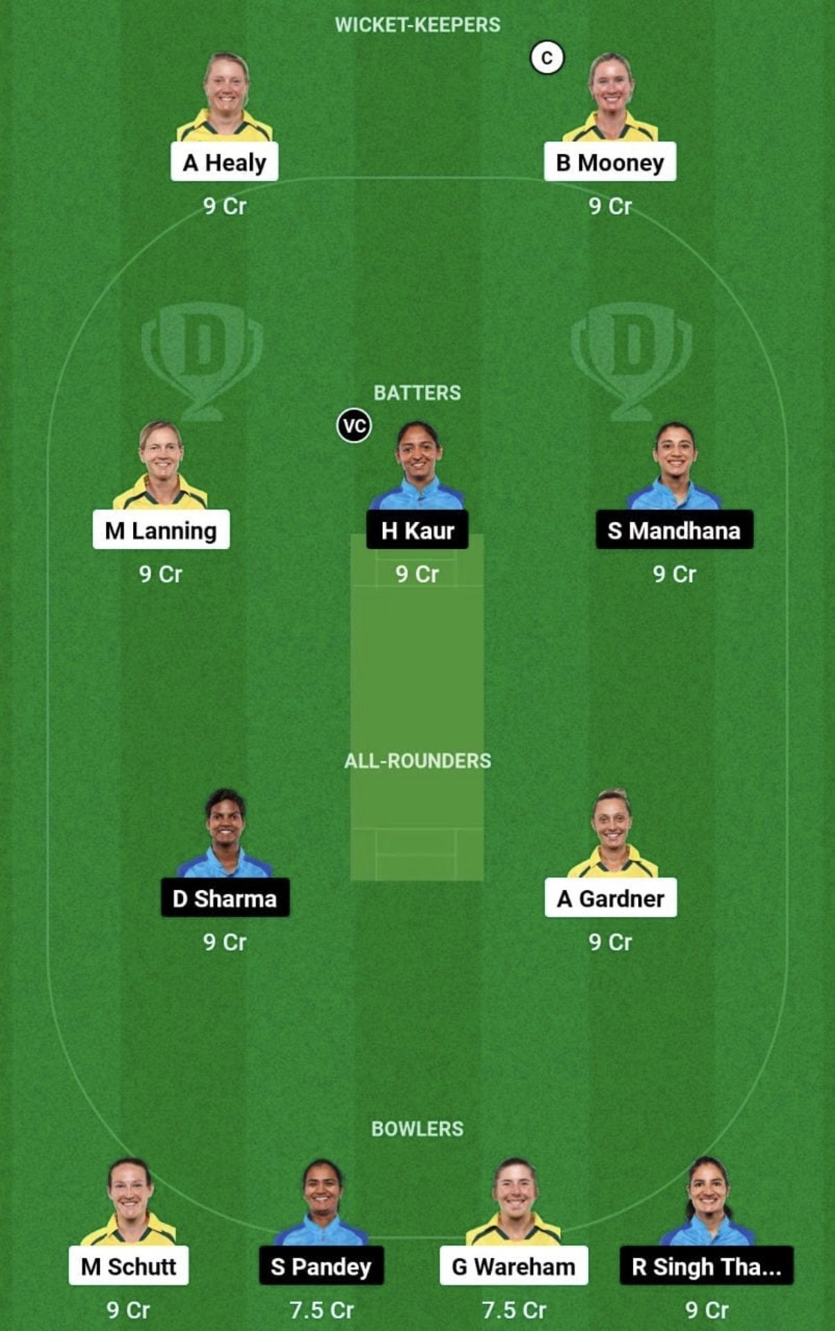 Beth Mooney, Alyssa Healy/Annabel Sutherland, Meg Lanning (c), Tahlia McGrath, Ellyse Perry, Ashleigh Gardner, Grace Harris, Georgia Wareham, Alana King, Megan Schutt and Darcie Brown.