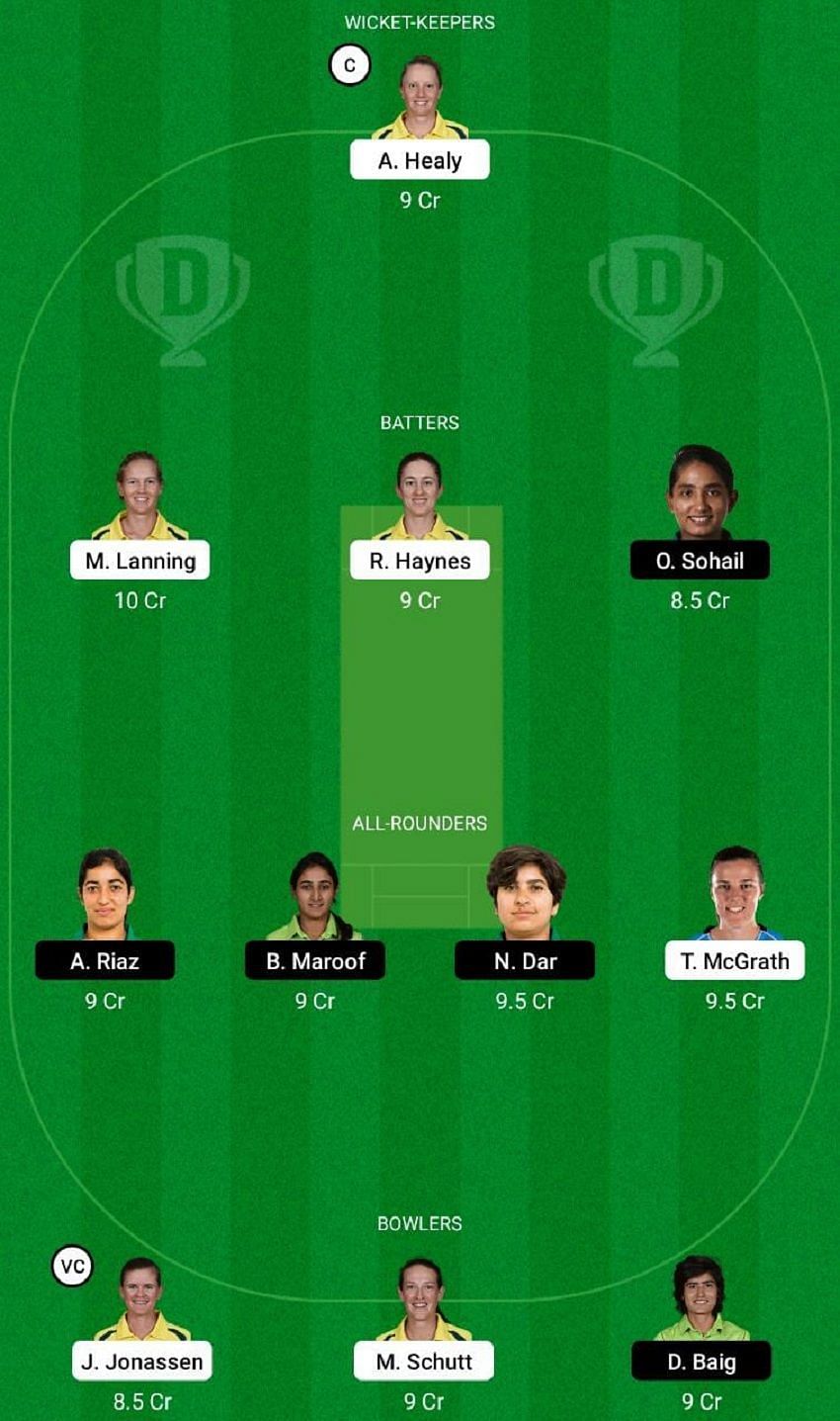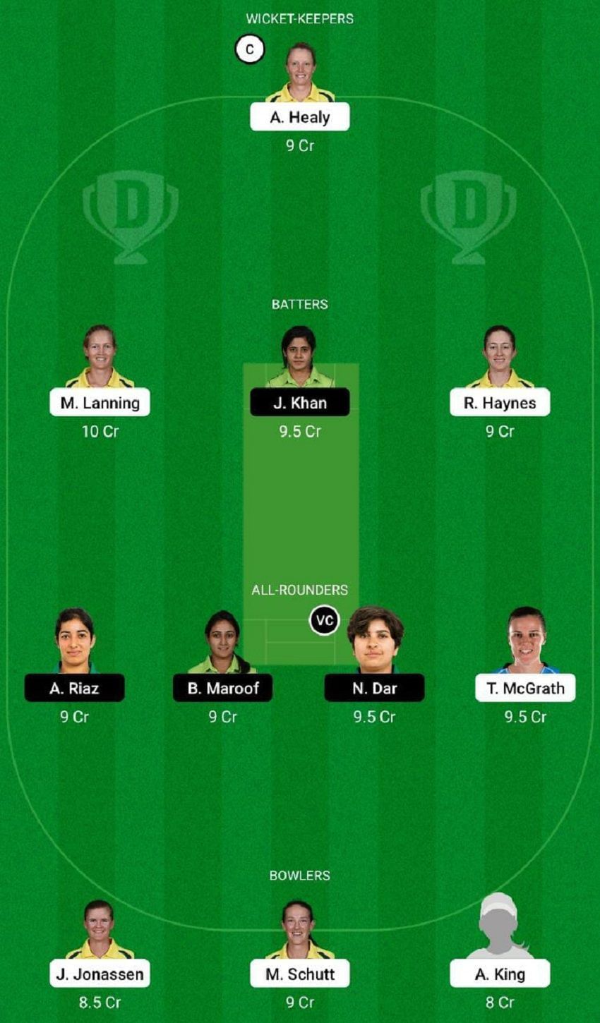 Fantasy Suggestion #1: Alyssa Healy, Meg Lanning, Javeria Khan, Rachael Haynes, Aliya Riaz, Bismah Maroof, Nida Dar, Tahlia McGrath, Jess Jonassen, Megan Schutt and Alana King.