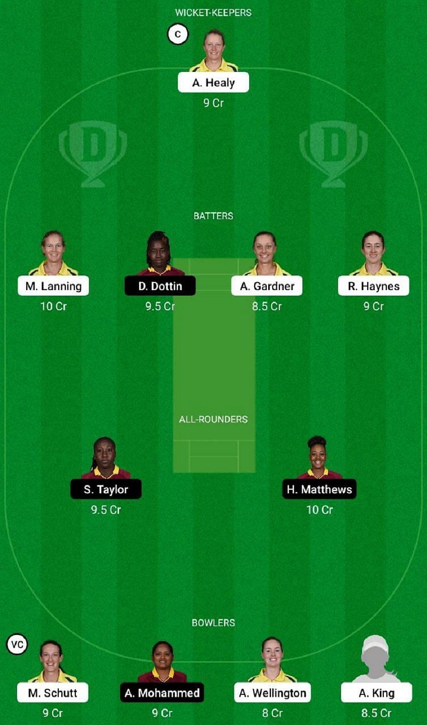 Fantasy Suggestion #1: Alyssa Healy, Meg Lanning, Deandra Dottin, Ashleigh Gardner, Rachael Haynes, Stafanie Taylor, Hayley Matthews, Megan Schutt, Anisa Mohammed, Amanda Wellington and Alana King.