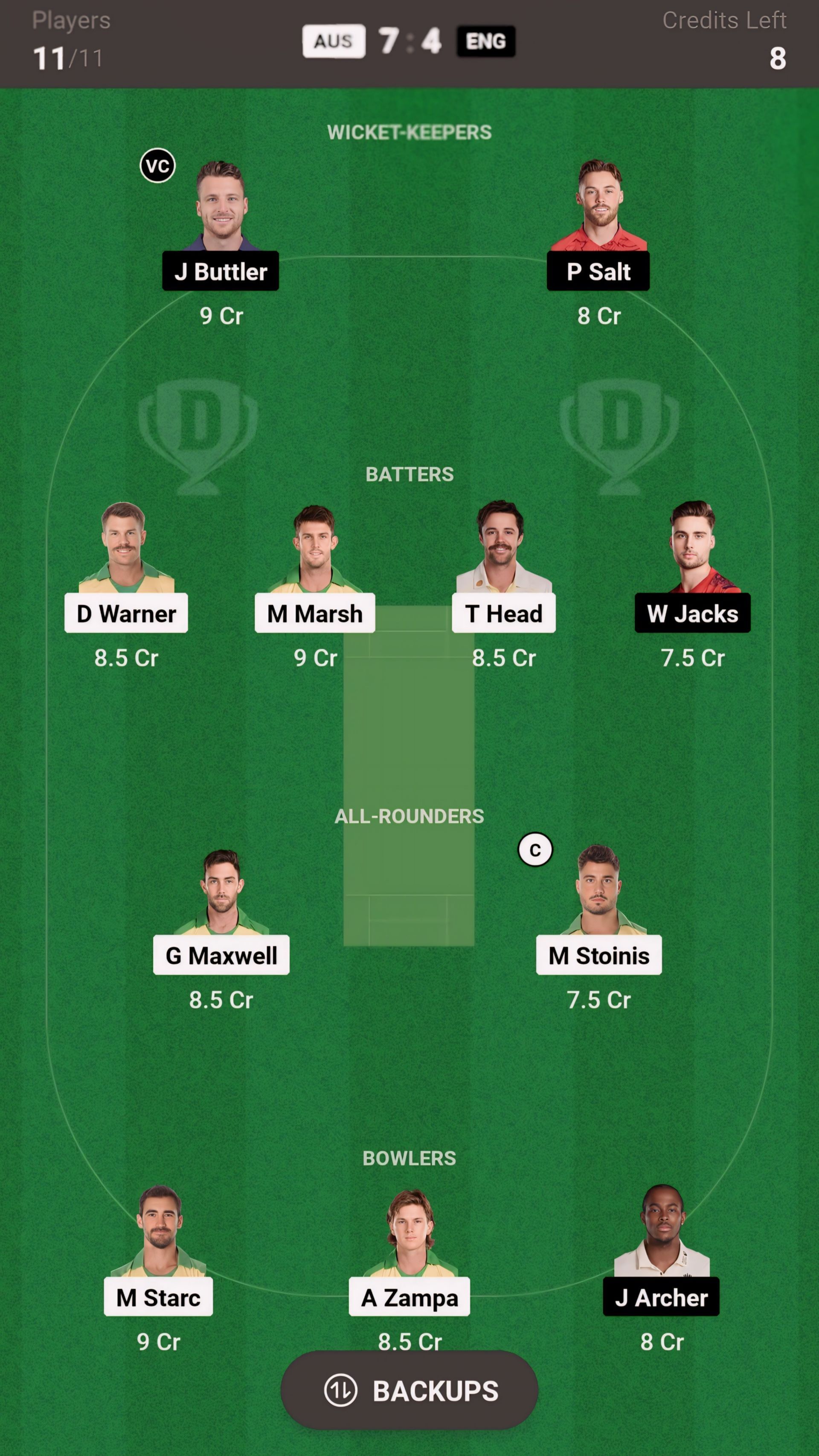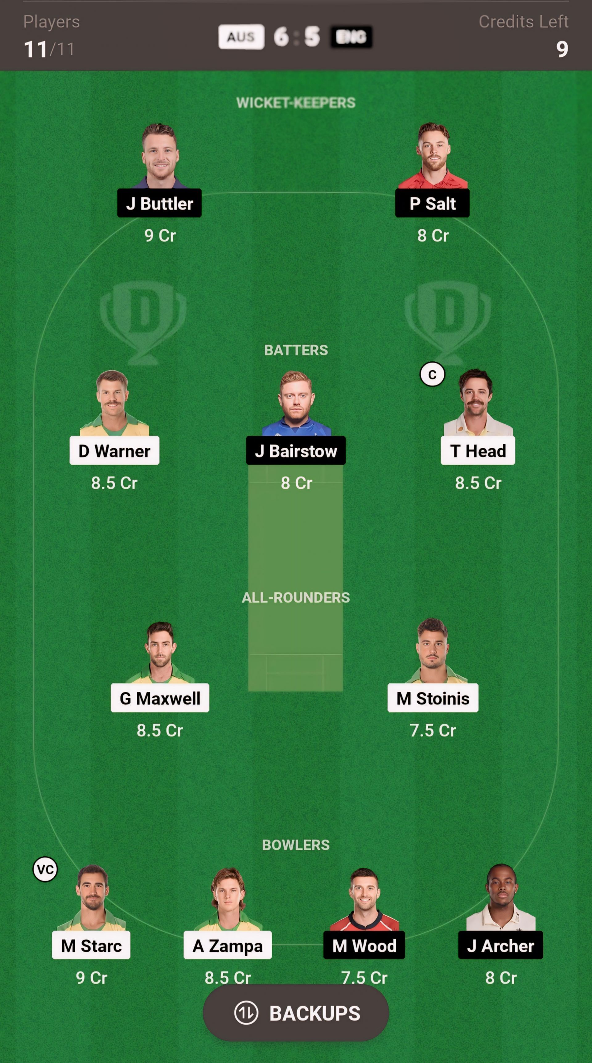 Bowlers: M Starc, J Archer, A Zampa, M Wood