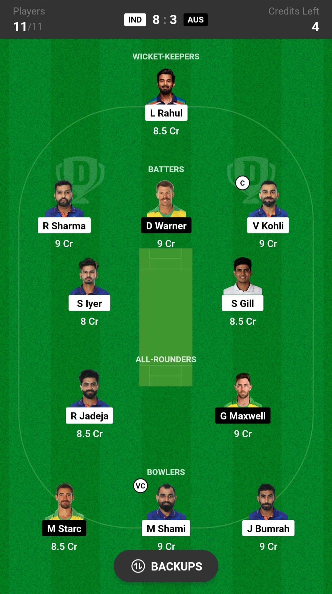Batters: D Warner, S Gill, V Kohli, R Sharma, S Iyer
