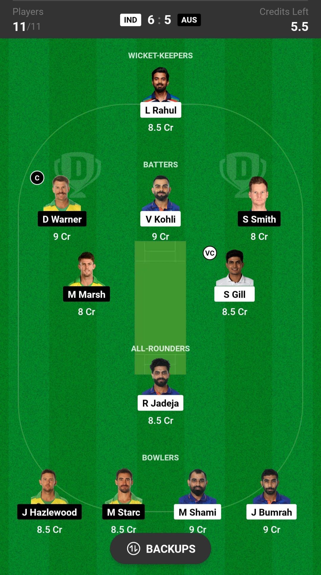 Batters: D Warner, S Gill, V Kohli, S Smith, M Marsh