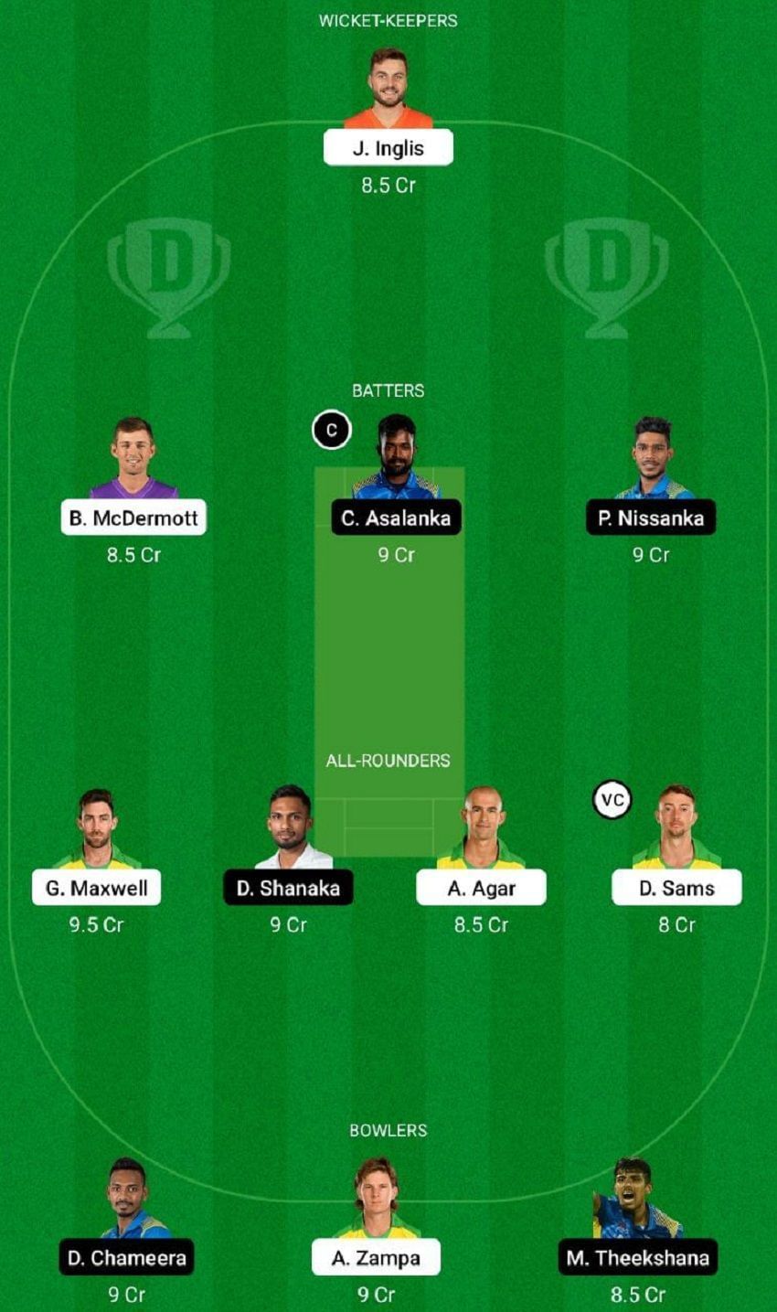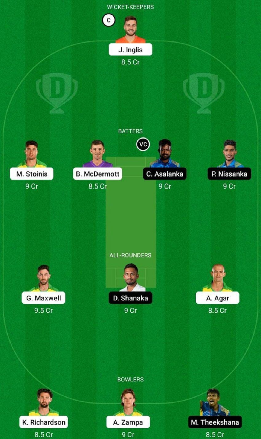 Fantasy Suggestion #1: Josh Inglis, Marcus Stoinis, Ben McDermott, Charith Asalanka, Pathum Nissanka, Glenn Maxwell, Dasun Shanaka, Ashton Agar, Kane Richardson, Daniel Sams and Maheesh Theekshana