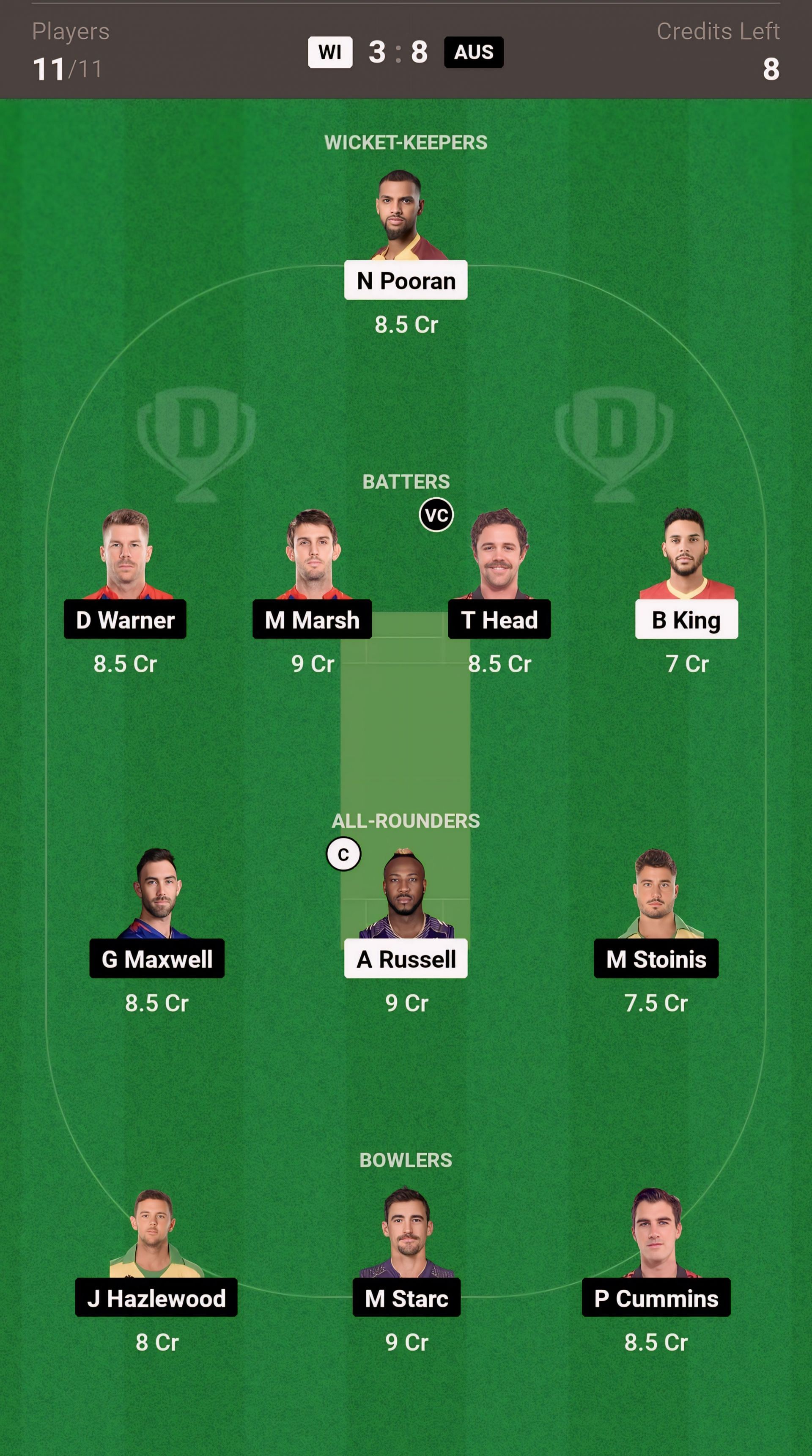 Travis Head and David Warner are the two best batsmen picks for today's Dream11 team. Travis Head played exceptionally well in the IPL. Though his last few innings were usually ducks, he is a person who should never be underestimated. Brandon King is another good pick for today's match. He was in exceptional form in the recent T20I against South Africa.