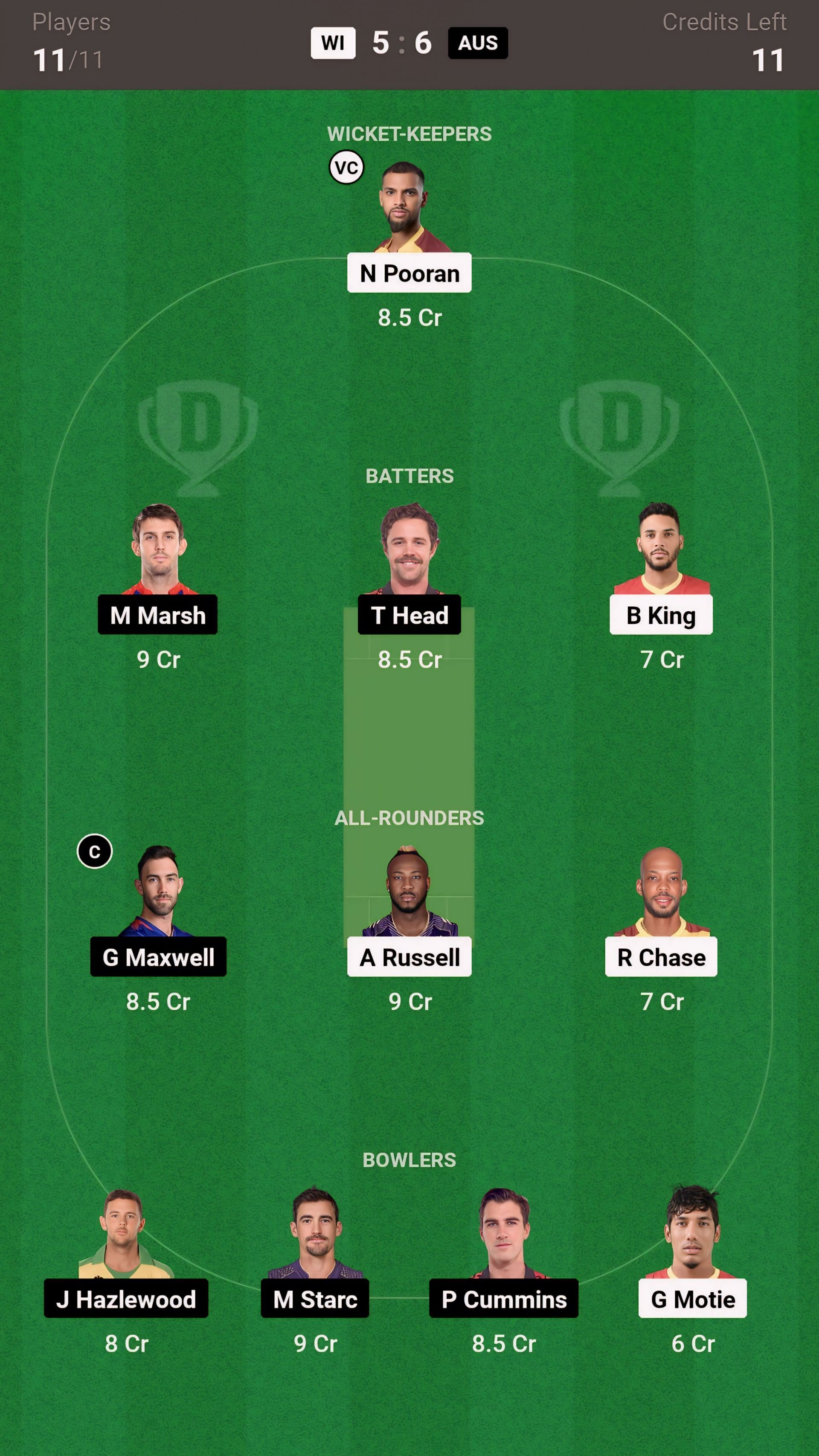 Glenn Maxwell and Andre Russell are the best all-rounder picks for the Dream11 team. Andre Russell recently won the IPL for Kolkata Knight Riders, where he took 19 wickets in just 15 matches. Marcus Stoinis is another good all-rounder who will bat in the middle order and bowl a good number of overs.