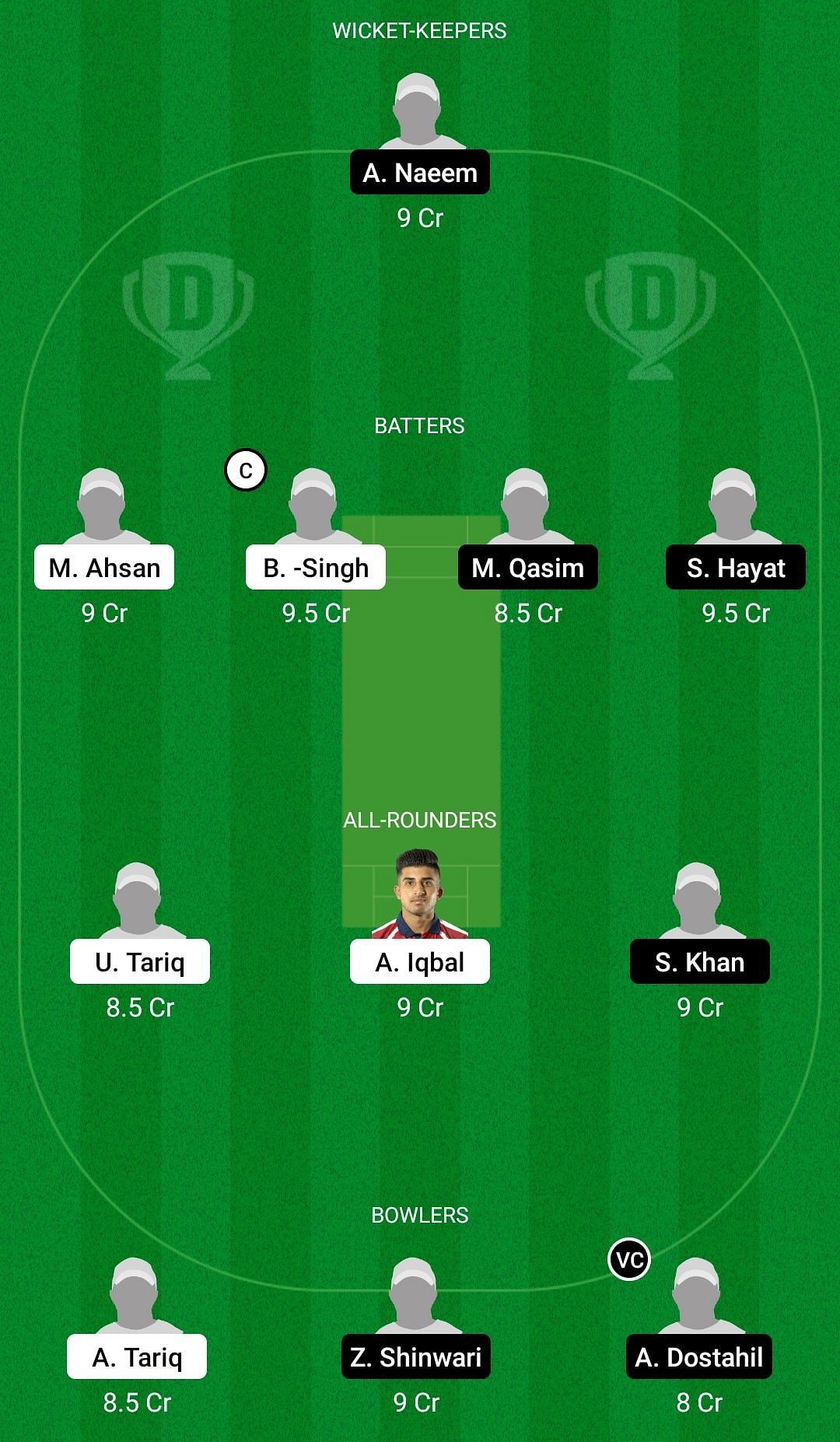 Fantasy Suggestion #1: Amar Naeem, Mirza Ahsan, Balwinder Singh, Muhammad Qasim, Sikandar Hayat, Umair Tariq, Aqib Iqbal, Shadnan Khan, Adeel Tariq, Ziaurahman Shinwari, Abuseen Dostahil