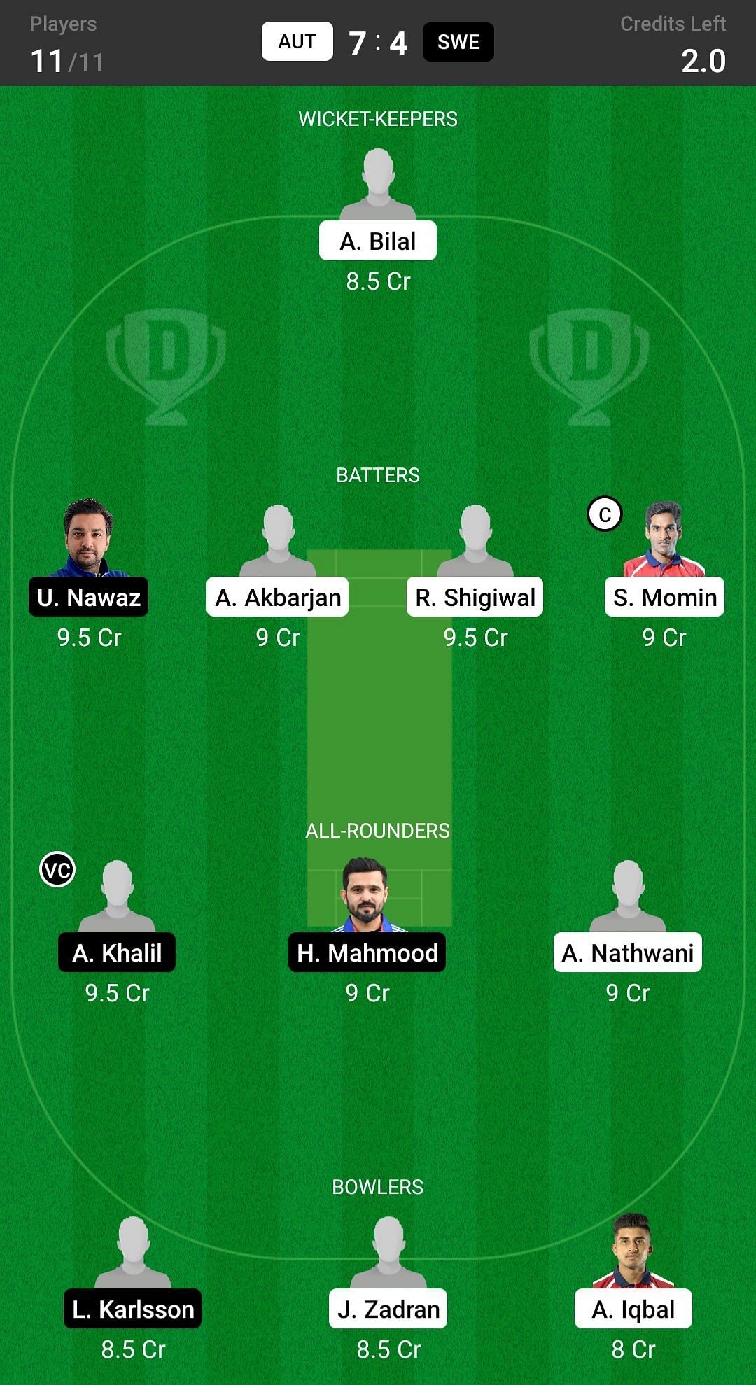 S Momin and R Shigiwal are the two best batsmen to pick in the Dream11 team. U Nawaz is another good pick for today's Dream11 team. He has smashed 56 runs in just 49 balls against Germany.