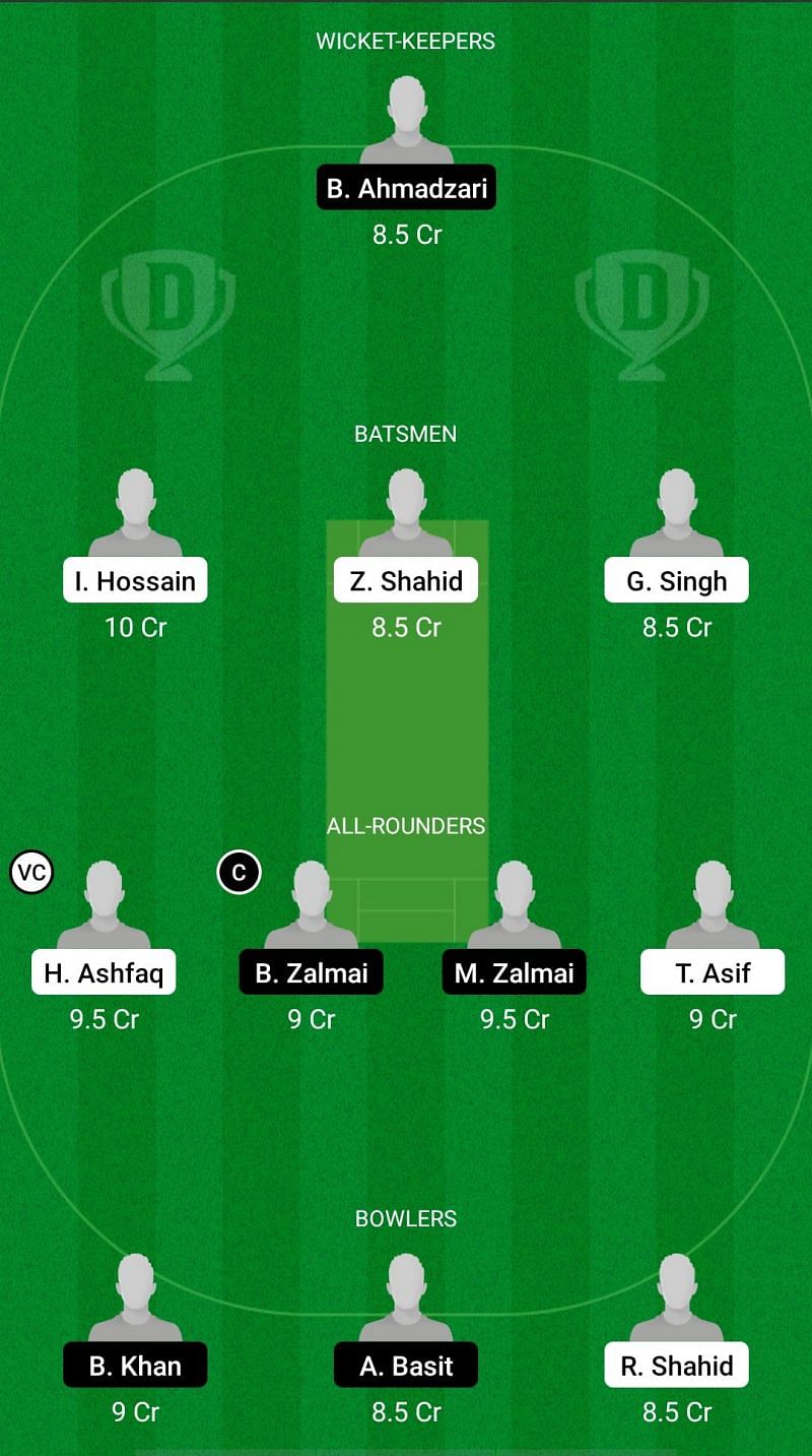 Fantasy Suggestion #1: Basheer Ahamadzari, Iqbal Hossain, Zayed Shahid, Gill Singh, Hassan Ashfaq, Bilal Zalmai, Mohammad Waqar Zalmai, Tauqir Asif, Baseer Khan, Abdulwaseed Basit, Rahat Shahid.