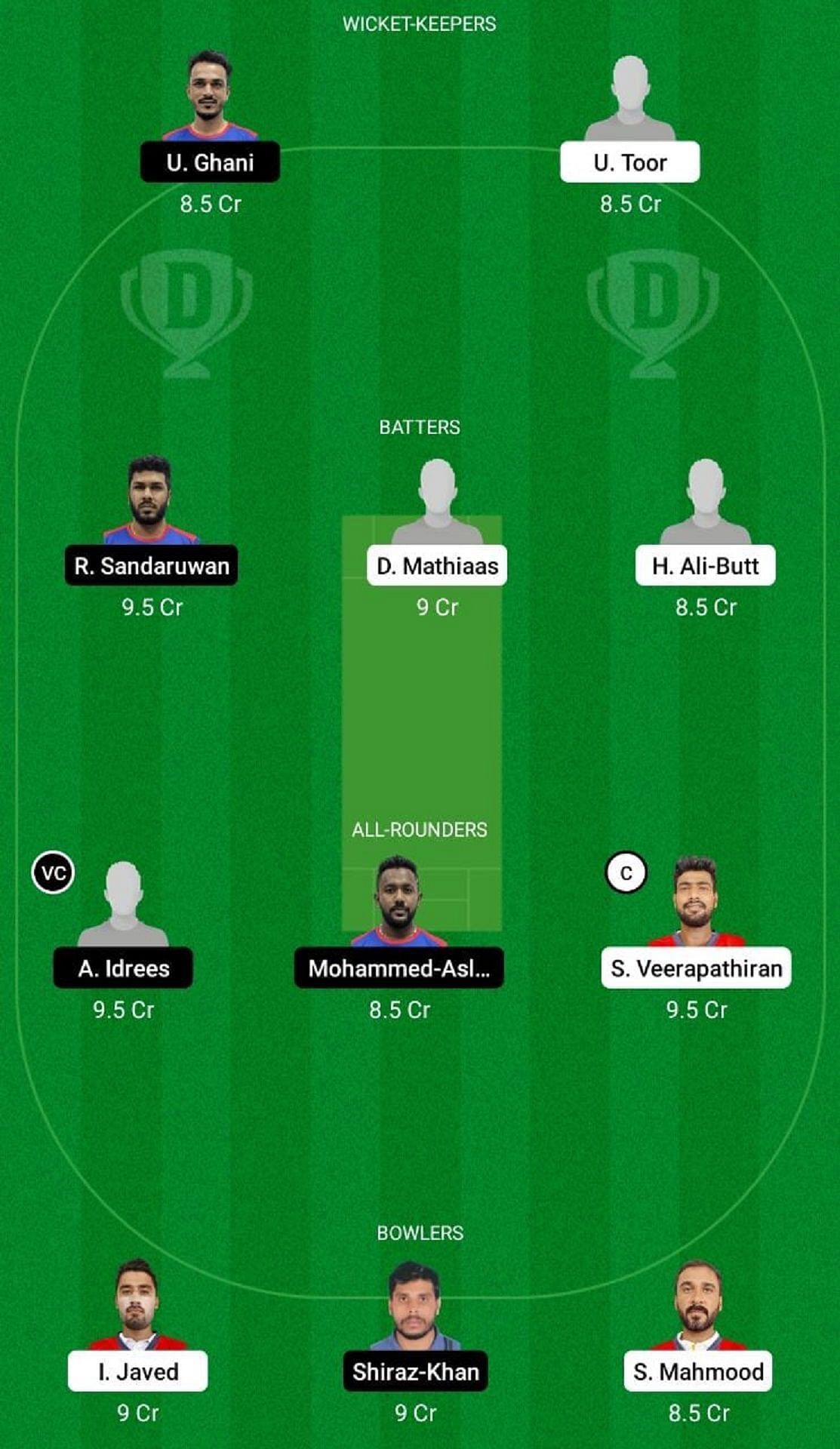 Fantasy Suggestion #1: U Ghani, U Toor, H Ali Butt, R Sandaruwan, D Mathias, S Veerapathiran, A Idrees, M Aslam, I Javed, S Mahmood, S Khan.