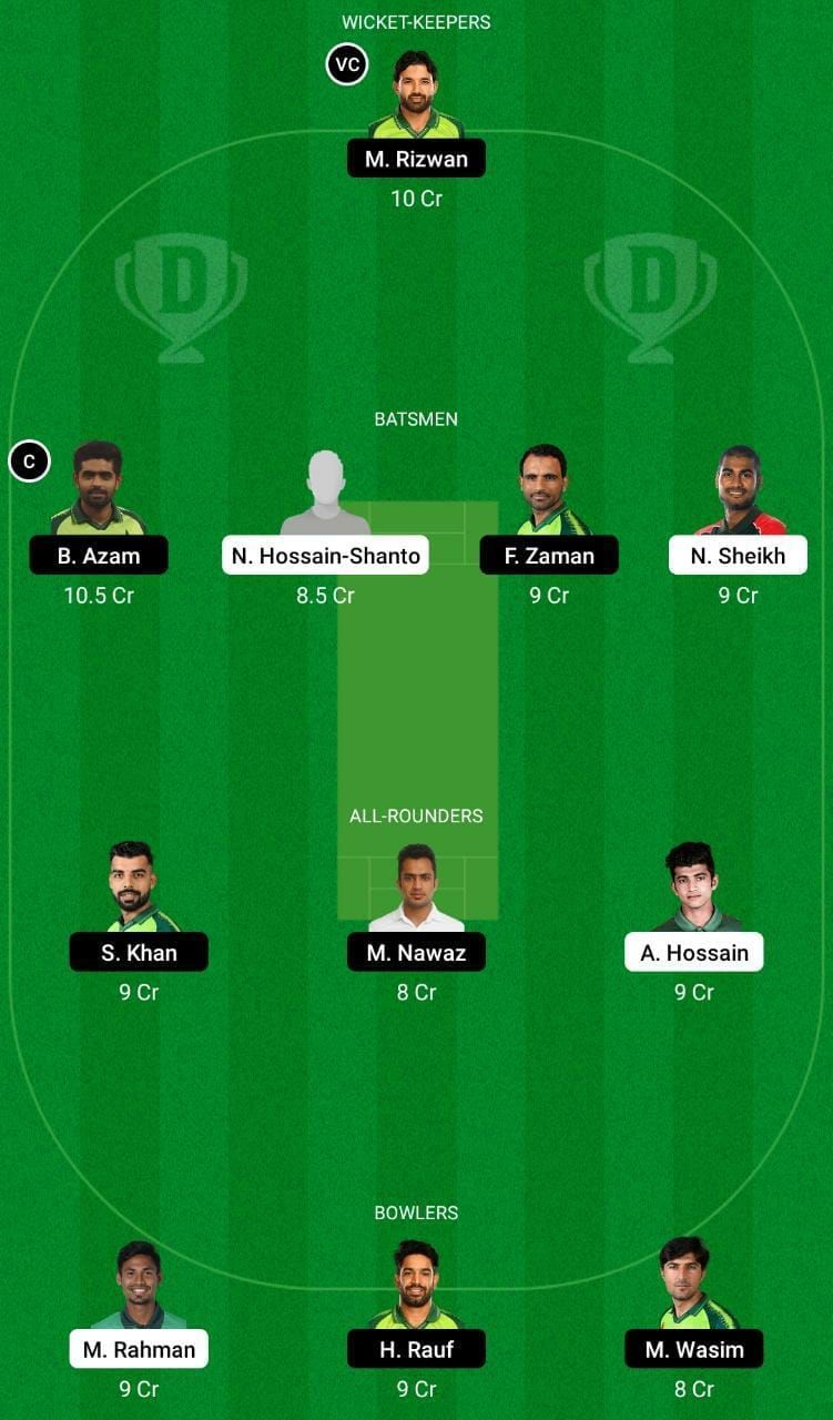 Fantasy Suggestion #1: Mohammad Rizwan, Babar Azam, Najmul Hossain Shanto, Fakhar Zaman, Naim Sheikh, Shadab Khan, Mohd Nawaz, Afif Hossain, Mustafizur Rahman, Haris Rauf and Mohd Wasim