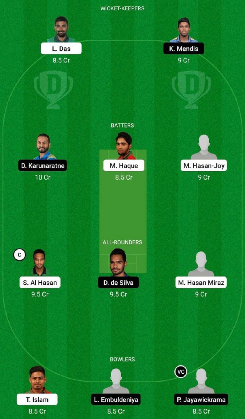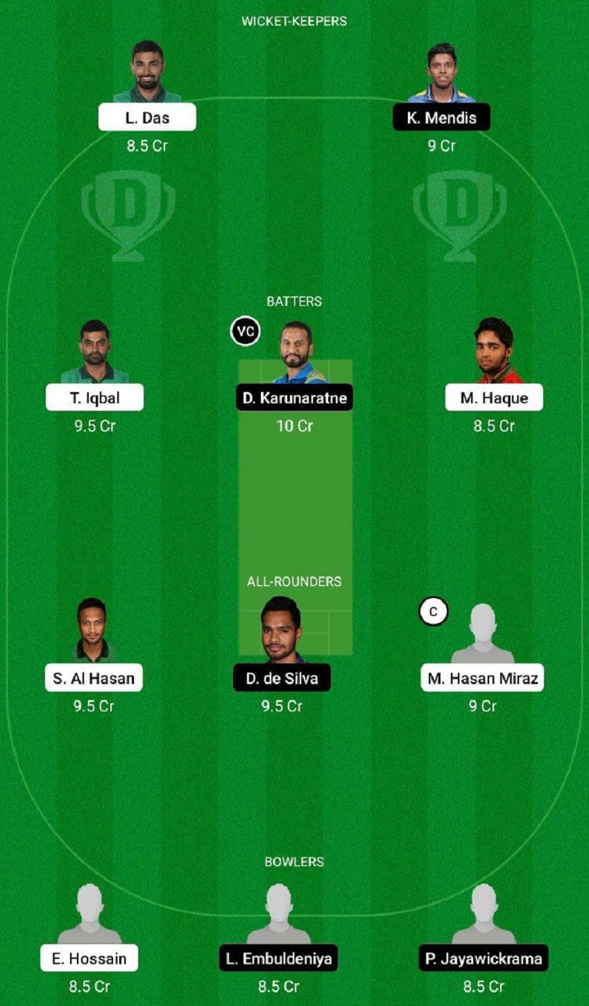 Fantasy Suggestion #1: L Das, K Mendis, T Iqbal, D Karunaratne, M Haque, S al Hasan, D de Silva, M Hasan Miraz, E Hossain, L Embuldeniya, P Jayawickrama